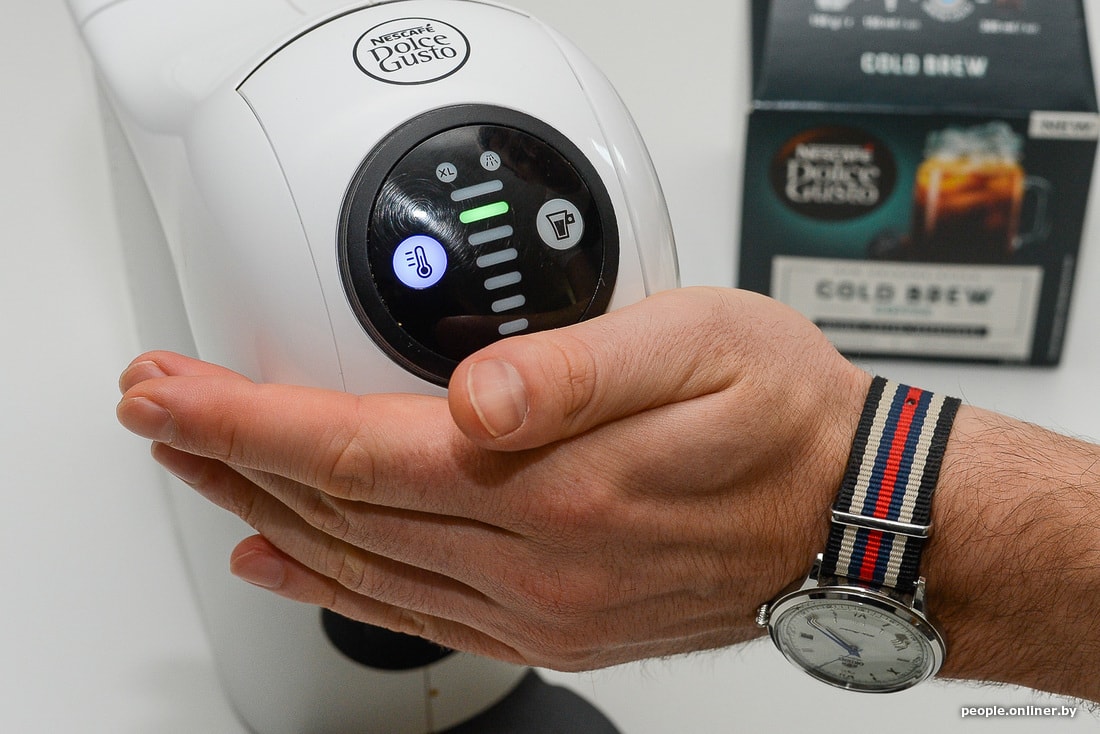 Капсульная кофеварка Krups Dolce Gusto Genio S, как и большинство аналогов, умеет готовить не только горячие, но и холодные кофейные напитки. Для этого достаточно нажать на специальную кнопку слева и сменить температуру воды. Холодную воду можно использовать, например, для Cappuccino Ice — это один из типов капсул системы Dolce Gusto.