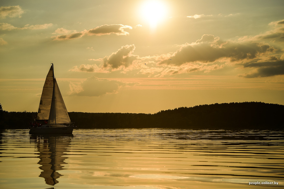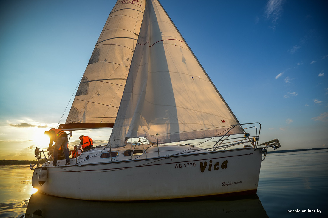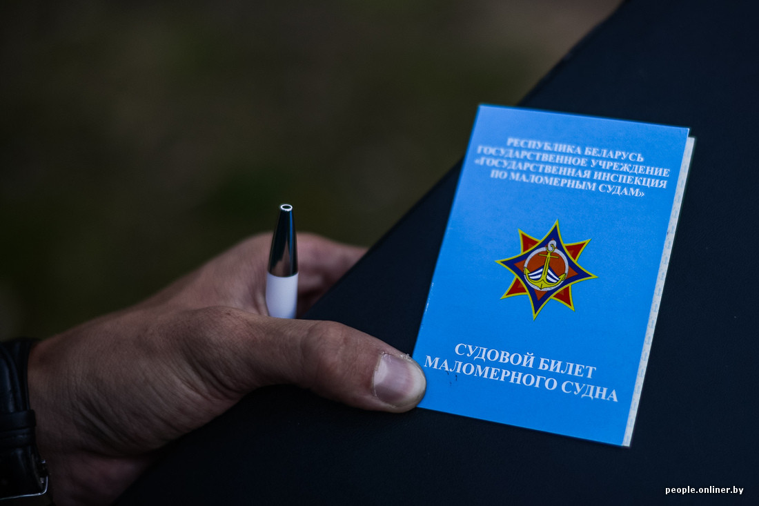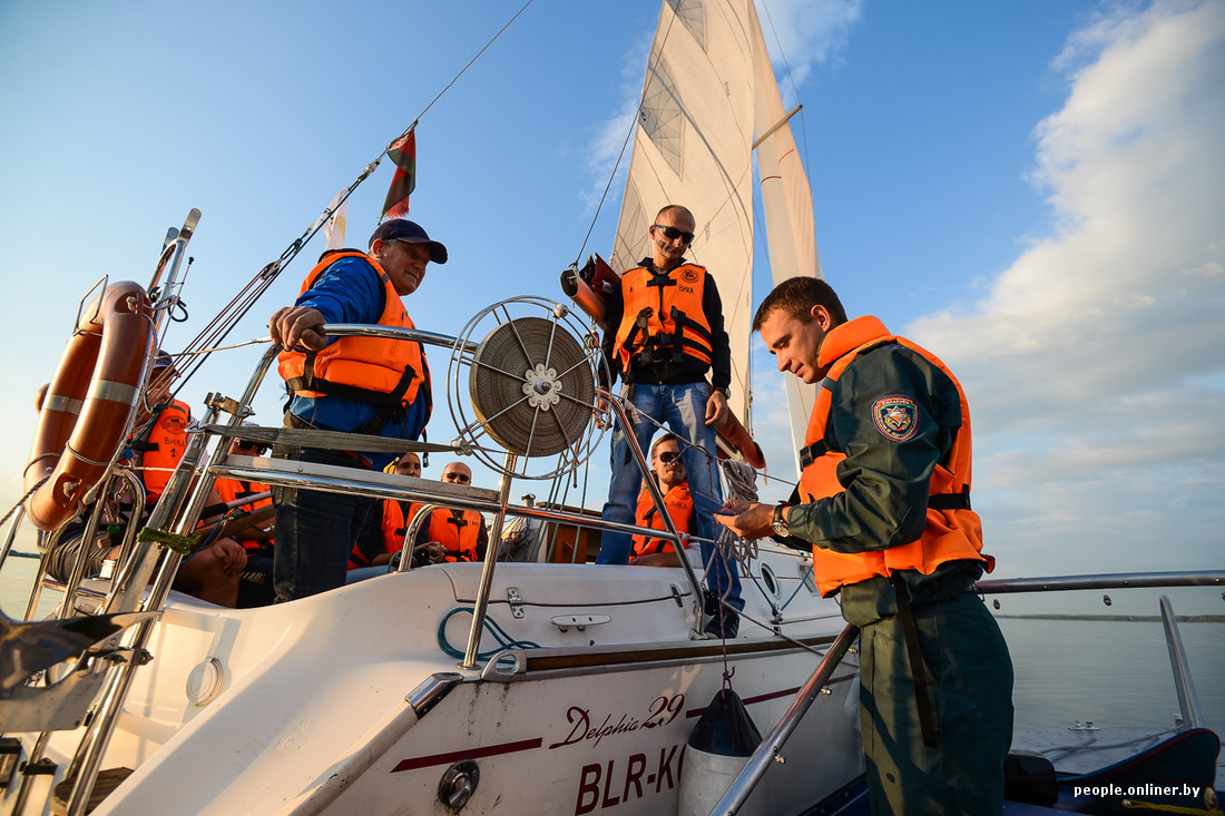 На горизонте появляется изящная, как сборная Беларуси по художественной гимнастике, яхта. Заходим на проверку. Ее водитель оказывается таким приветливым и лучистым, что хочется залезть на палубу и устроить обнимашки. На яхте сплошь законопослушные граждане. Судовой билет и удостоверение судоводителя в норме.