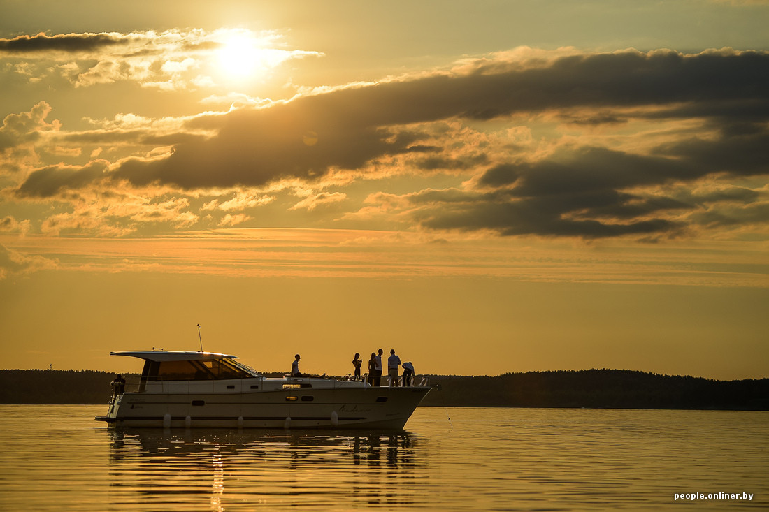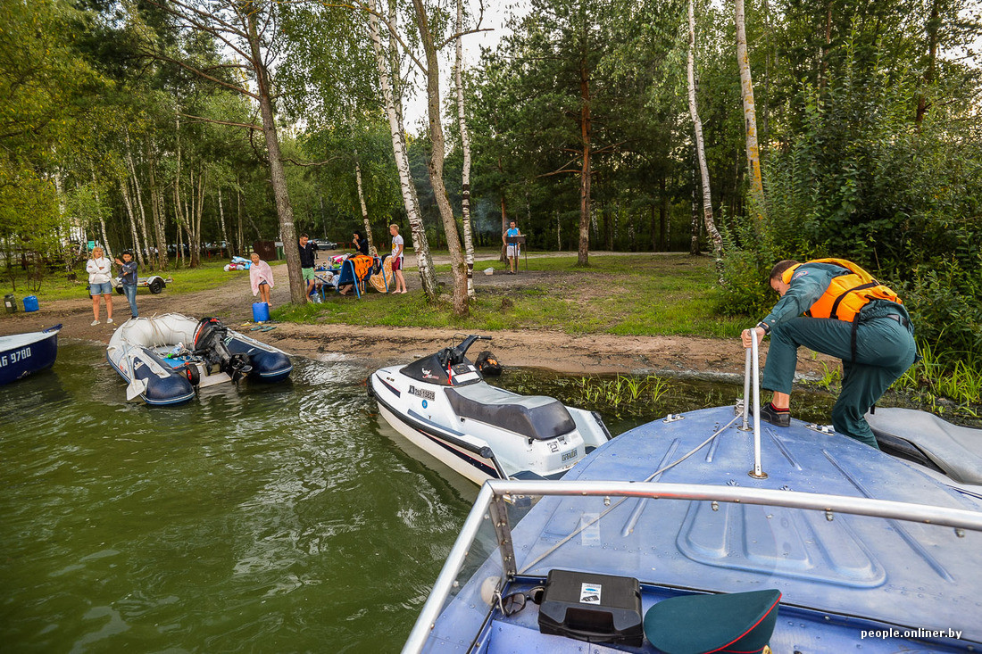 На Минском море спокойно. Упитанные чайки медитируют на тихих волнах. Занимается высокохудожественный закат. Работа у Антона Астапенко зависит от людей. Как только на воде начинается движение, он прыгает в катер и выезжает в рейд контролировать, чтобы все было пучком. Самое горячее время — вечер. По будням на лов выходят рыбаки. Ближе к выходным прибывают на отдых владельцы яхт и гидроциклов.