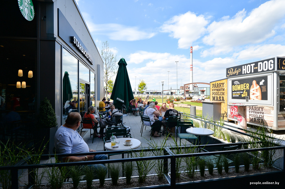 В будний день народу в аутлете не очень много. Нет толкотни, покупатели не трутся друг о друга. Периодически мы слышим русскую речь. Работает «столовка» с чешской едой по бросовым ценам.