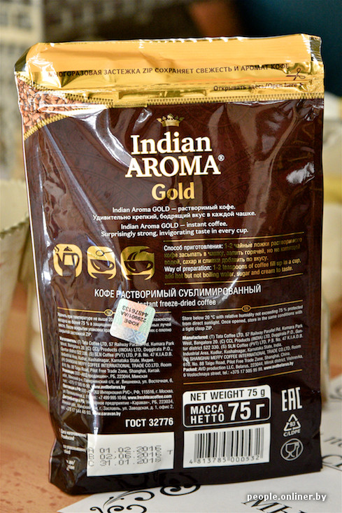 «Золотой, но недорогой», как написано на пакете. Это тоже напиток от «АВД продакшен», но из сегмента подороже — сублимированный кофе. Значит, более ароматный и насыщенный по вкусу. Так и есть: открываете замок пакета — и окунаетесь в мир индийского кофе из жестяных банок времен СССР. Там, правда, был совсем порошок, но этот аромат не спутать ни с чем. В отличие от MiCafe, на пачке Indian Aroma производитель пишет, что кофе он фасует индийский.