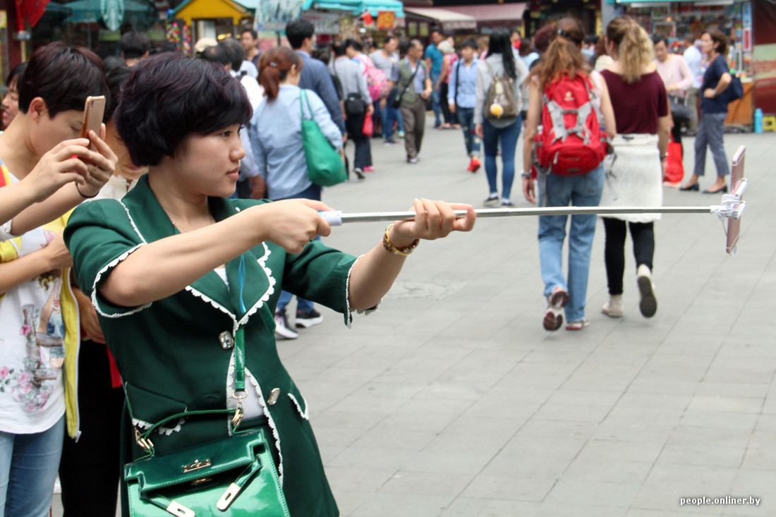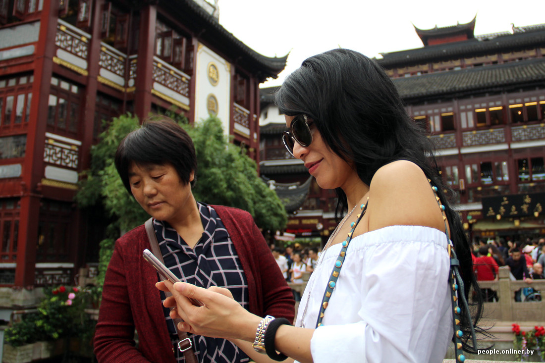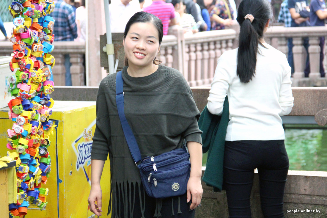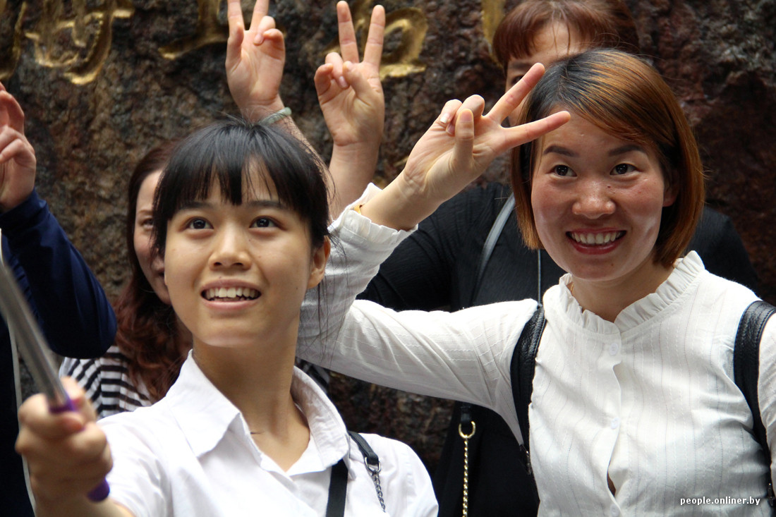 Как китайцы фотографируются с европейцами. Местный житель долго стесняется подойти. Наконец он аккуратно трогает иностранца за плечо, жестами просит о фото. Согласие вызывает громкий возглас и широчайшую улыбку. Пока фотограф готовится, китаец стоит на расстоянии шага от европейца, но в последний момент решительно приближается и может, к примеру, его приобнять. Это, видимо, расценивается как наивысшая храбрость.