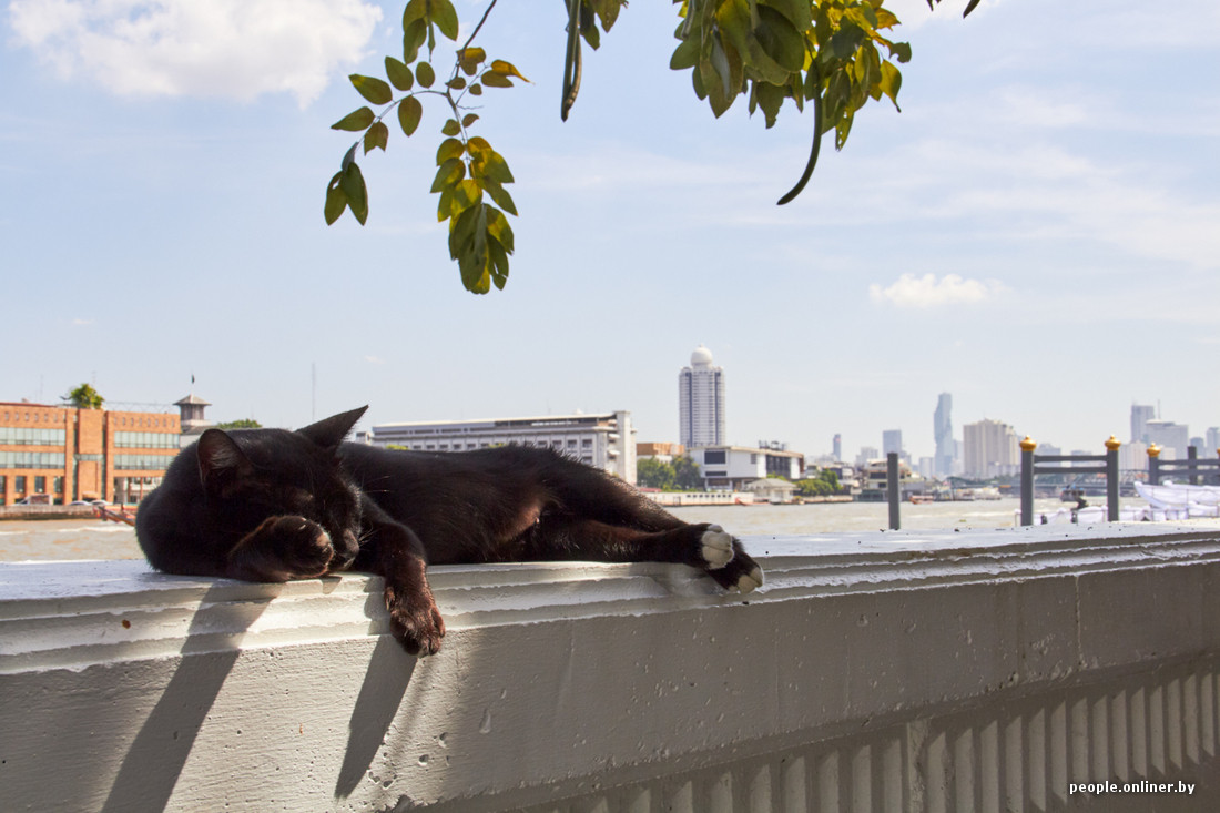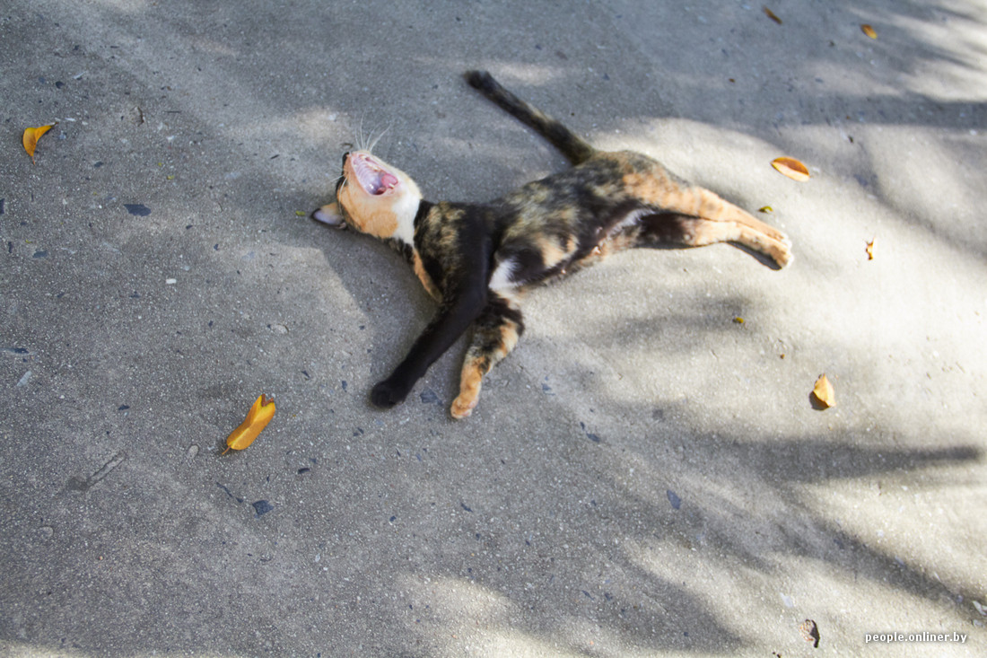 Кто к туристам совершенно равнодушен, так это местные котики. Хотели бы сейчас оказаться на их месте? А они всегда такие. За почти что неделю я видел стоящих на лапах котов дважды. Один поднялся, чтобы сербануть воды, второй оказался на пути электромобиля — пришлось отойти на метр в сторонку, но немедленно снова лечь.