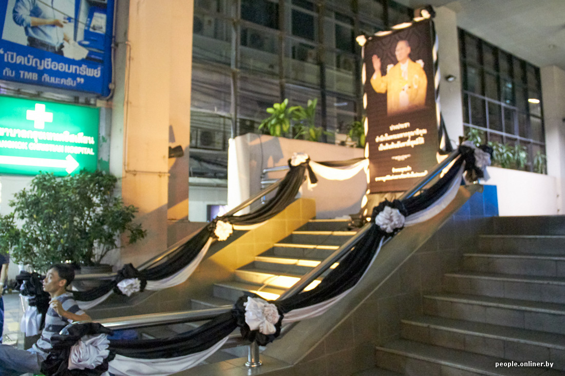 Столица королевства остается погруженной в траур. Километры лент из черной и белой ткани и портреты Пхумипона Адульядета напоминают о печальном факте почти на каждой улице.