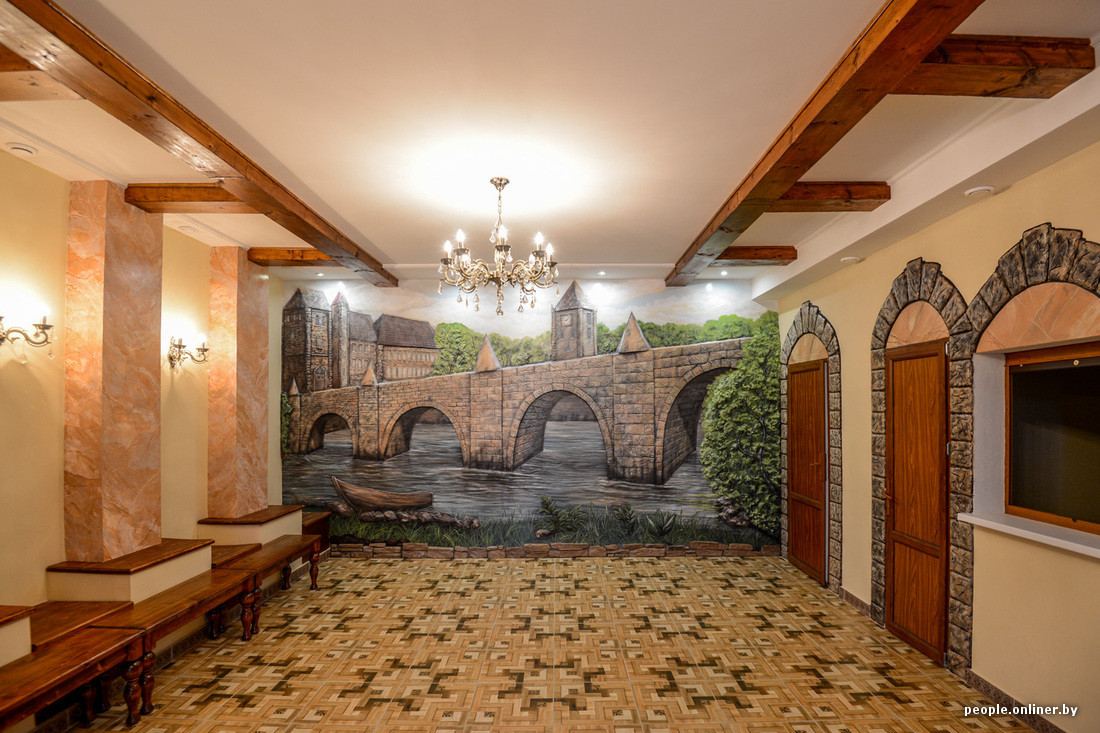 — У нас есть свой талантище — штукатурщица одна. Она все разрисовывала, лепила и украшала, — объясняет начальник юридического отдела Круглянской ПМК №266, а по совместительству наш гид Николай Курносов. — Мы подумали: а зачем будем кого-то нанимать, если все это может наша работница сделать? А вообще, все свои идеи реализовываем сами — от концепции до укладки плитки. Сами продумываем, обсуждаем, а потом и строим. И мне кажется, неплохо выходит.
