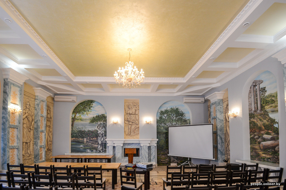 Большой конференц-зал с высокой лестницей и изображениями античных богов — это особая гордость комплекса.