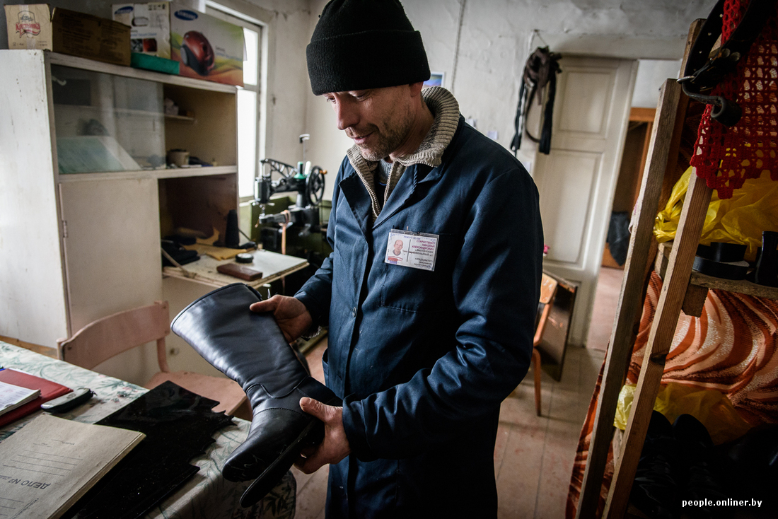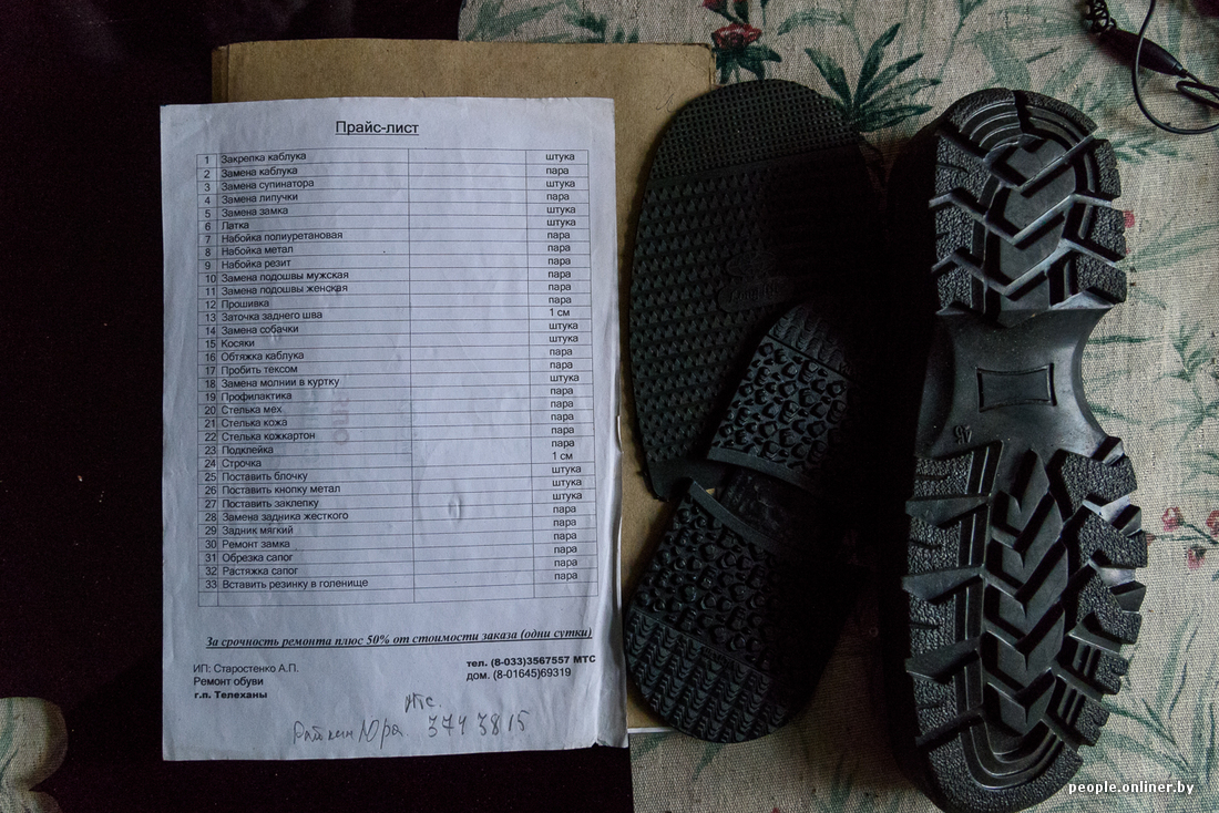 — Да, делаю. Отучился, вот у меня даже сертификат есть. Работал в Ивацевичах, а тут стали звать в Телеханы. Так полтора месяца назад и открылся. Тут еще, конечно, ремонт буду делать, чтобы выглядело все хорошо. Спрос есть. Обувь-то нынче дорогая: 70—100 рублей новые кожаные ботинки стоят.