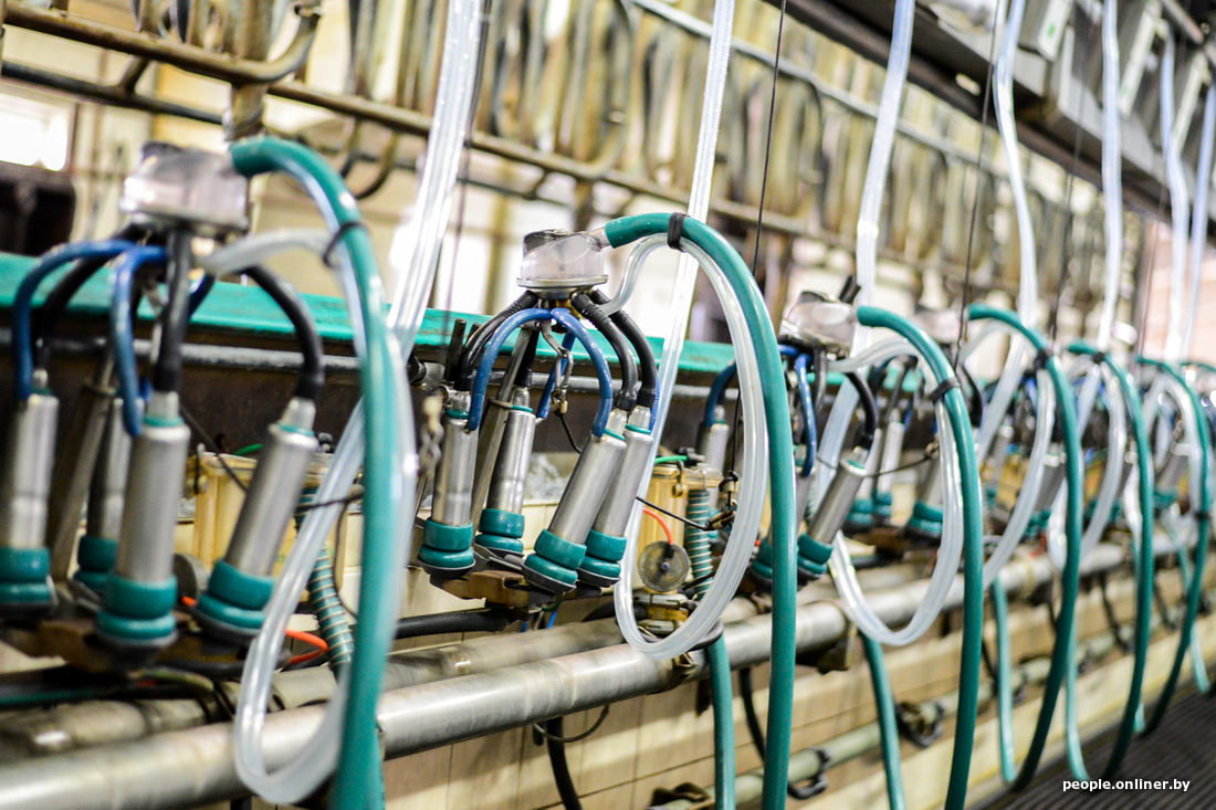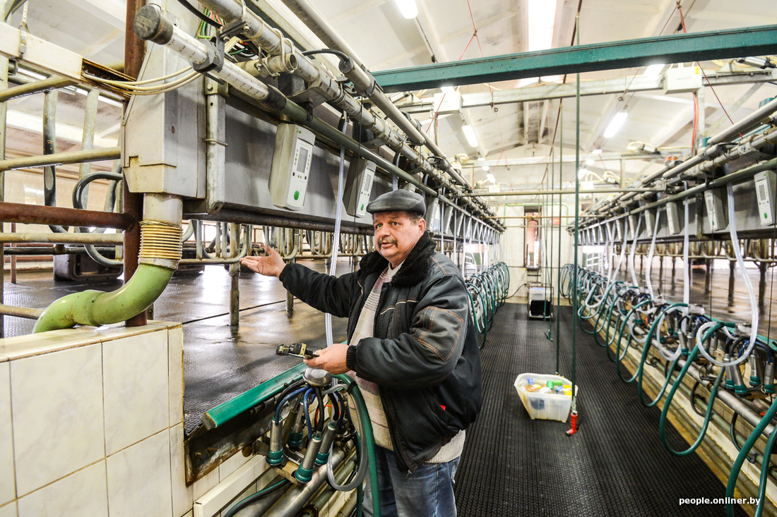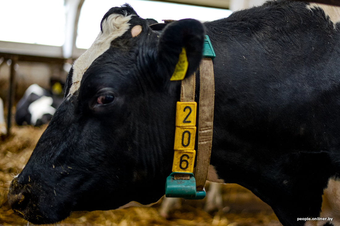 — У нас есть разные фермы, но в основном работаем при полной автоматизации на немецком оборудовании, — объясняет добродушный усатый бригадир производственной бригады в животноводстве Николай Липский. Вокруг него мычат коровы. У некоторых синие ошейники — это рекордсменки, которые в день дают больше 50 литров молока.