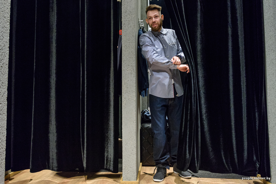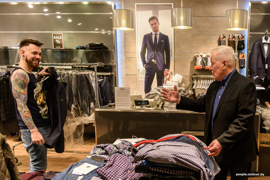 Антон озадачен. Парень выбирает между майкой с цветастым принтом и более консервативной рубашкой. В итоге складывает в примерочной Вячеслава Васильевича оба варианта.