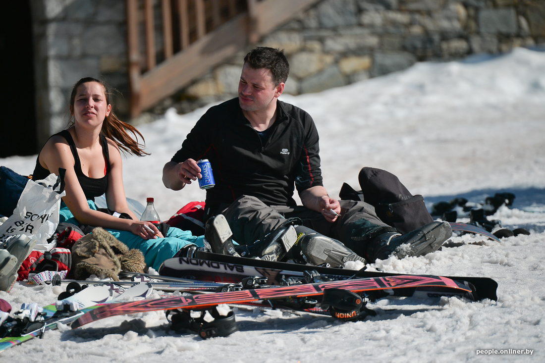 Над головой здесь кружатся кабинки подъемников, люди, а не боги, отдыхают на лавочках, сидят в кафешках, пьют пиво и вино. Весенняя благодать!