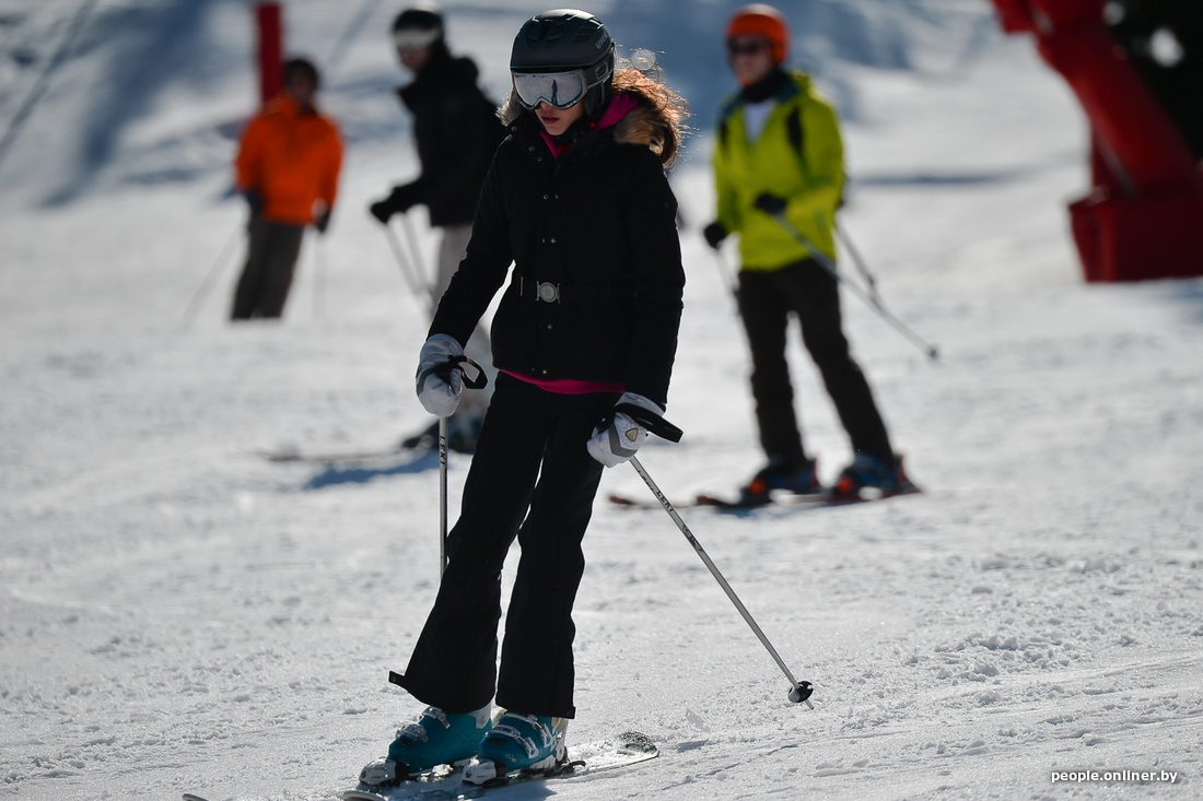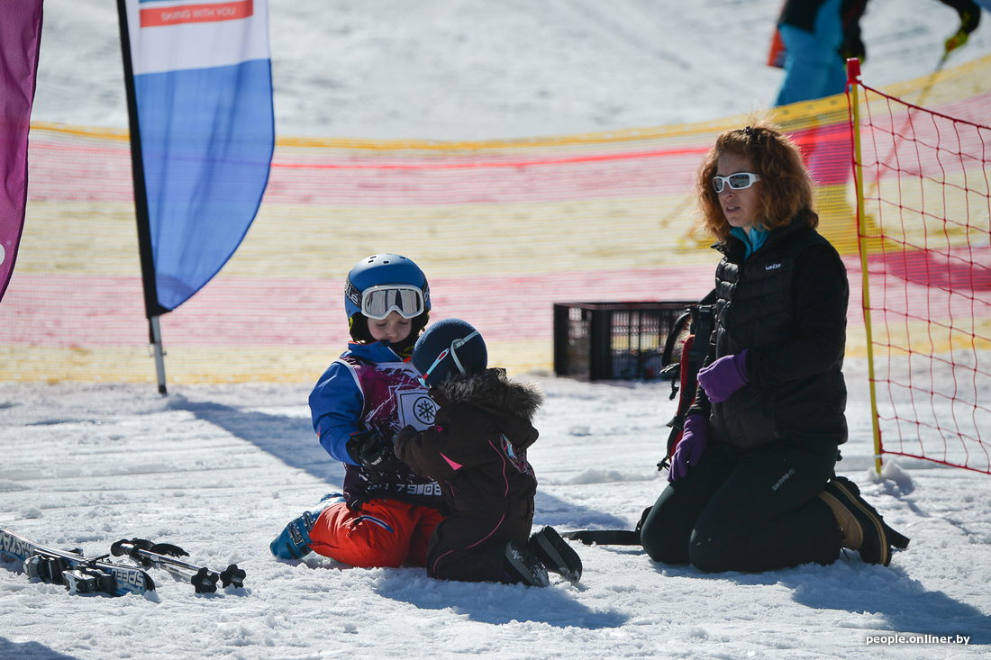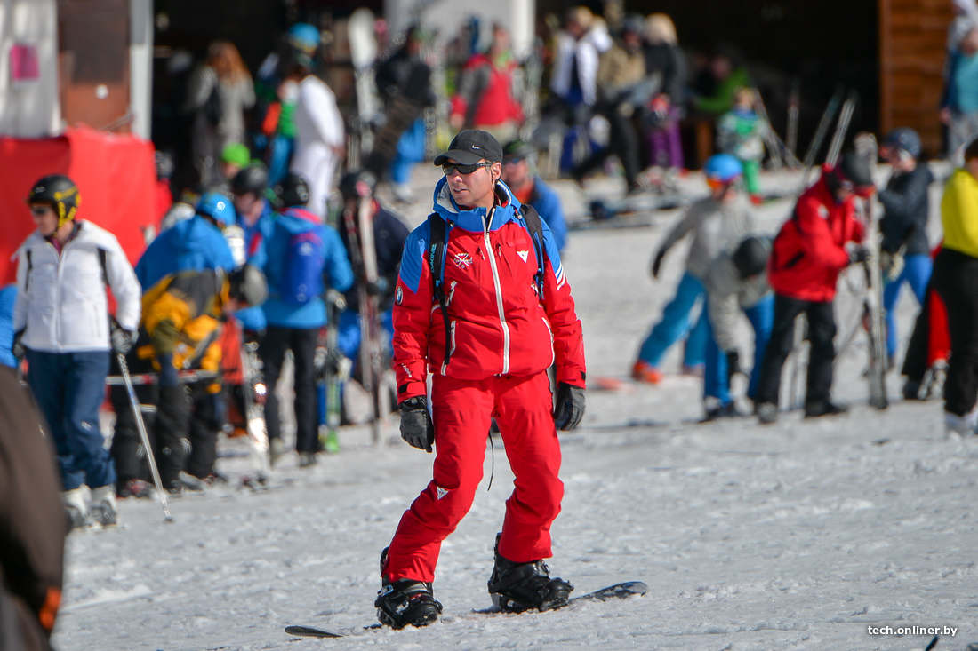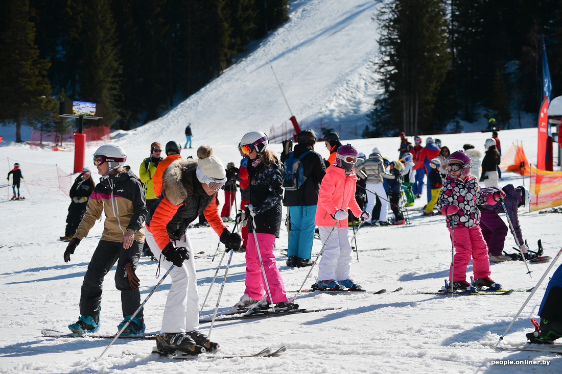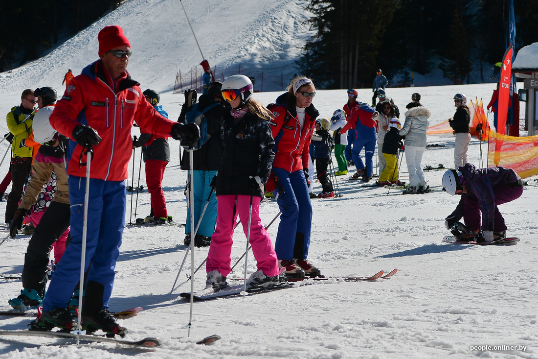 Больше всего людей у подъемников, где трассы пологие и широкие. Здесь же учатся катанию детишки.