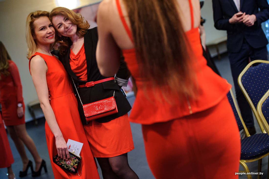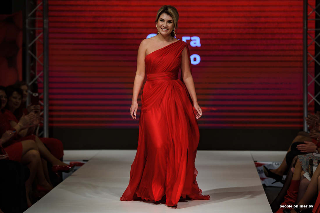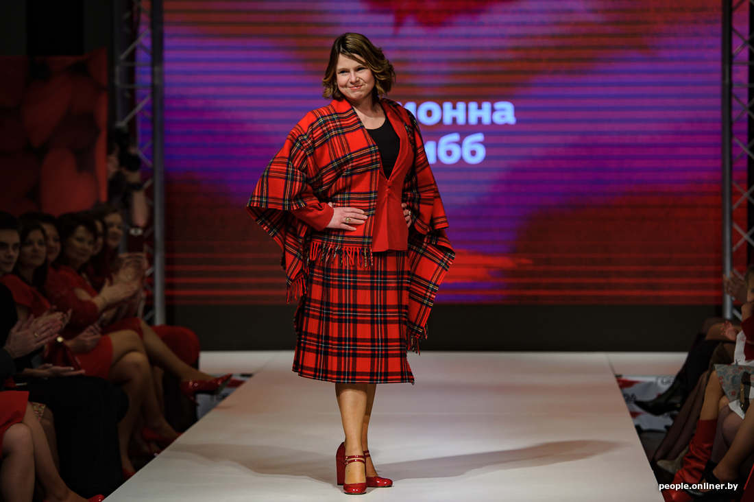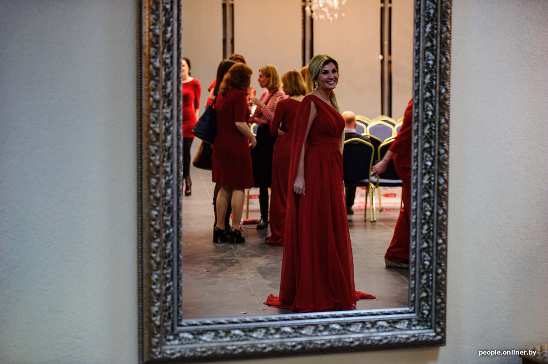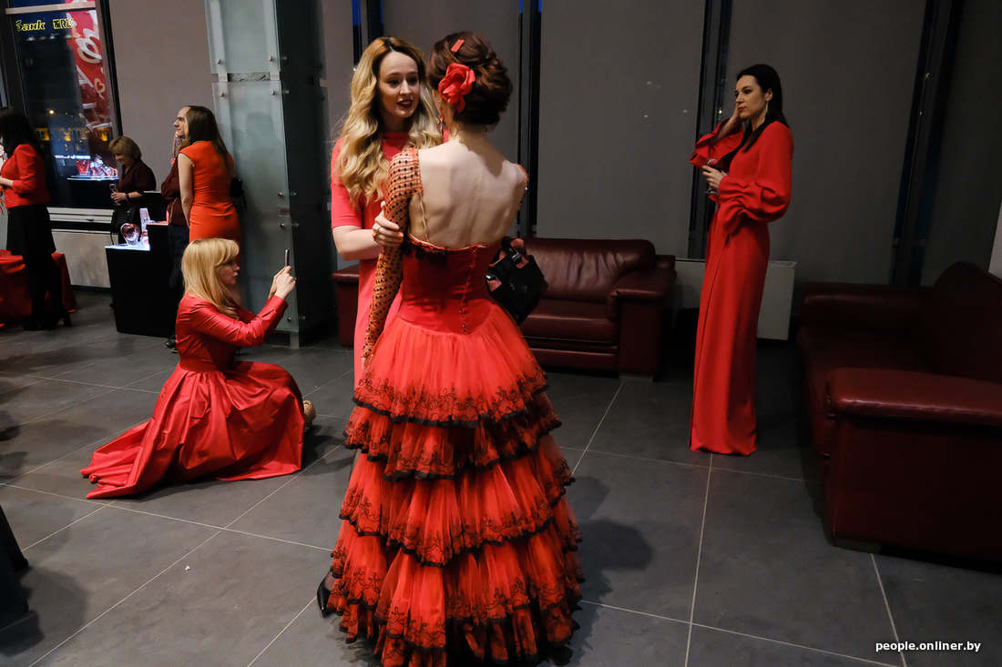 Тем временем на сцене появляются главные героини вечера — известные белоруски в красных платьях. Выборка медиаперсон совершенно разнородная: здесь и посол Великобритании Фионна Гибб, и баскетболистка клуба «Цмокi-Мiнск» Диана Сизонова, и «Мисс Беларусь» Василиса Рымжа, и прима-балерина Большого театра Ольга Гайко — всего 20 женщин в вечерних платьях. Самый строгий наряд был, пожалуй, у госпожи посла — в национальном шотландском стиле.