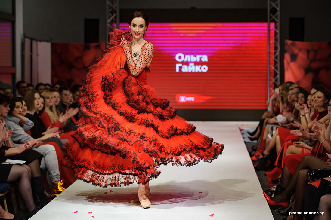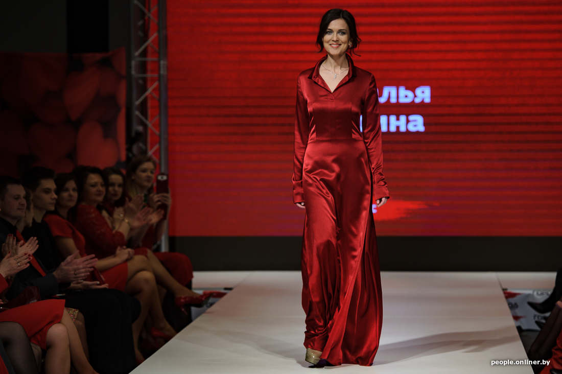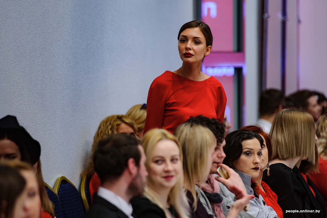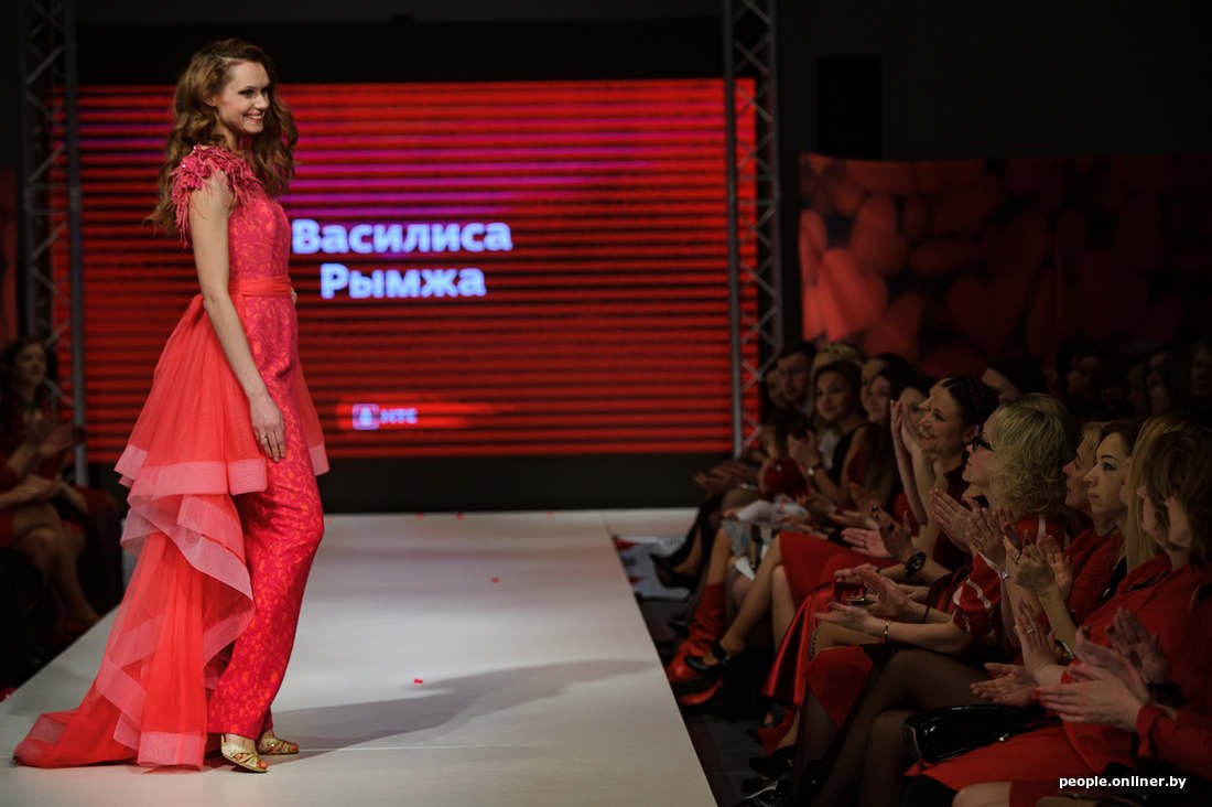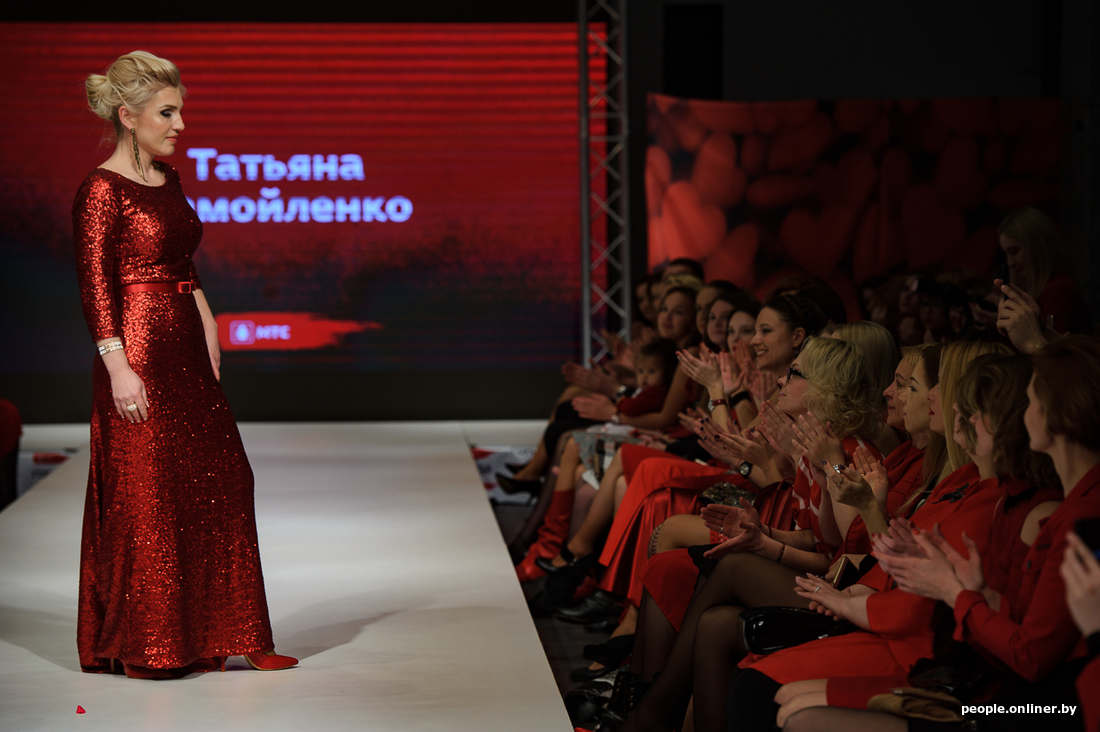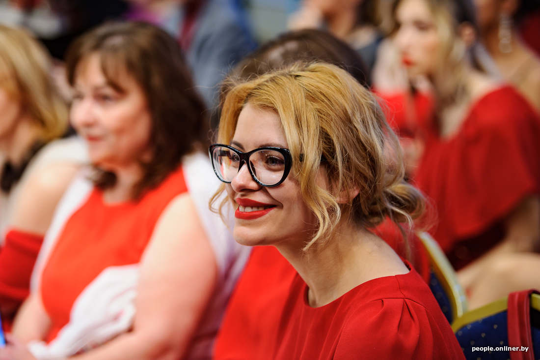 Тем временем на сцене появляются главные героини вечера — известные белоруски в красных платьях. Выборка медиаперсон совершенно разнородная: здесь и посол Великобритании Фионна Гибб, и баскетболистка клуба «Цмокi-Мiнск» Диана Сизонова, и «Мисс Беларусь» Василиса Рымжа, и прима-балерина Большого театра Ольга Гайко — всего 20 женщин в вечерних платьях. Самый строгий наряд был, пожалуй, у госпожи посла — в национальном шотландском стиле.