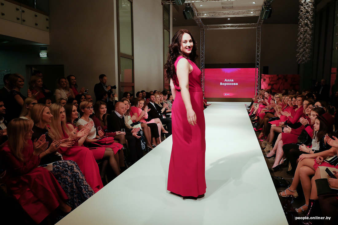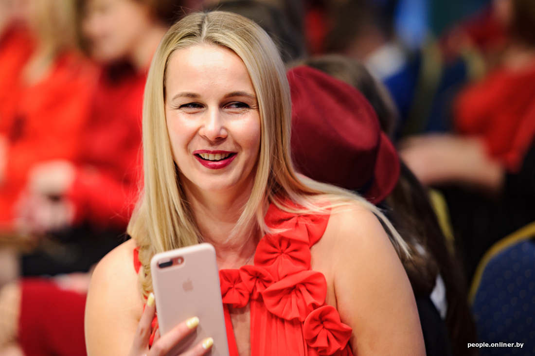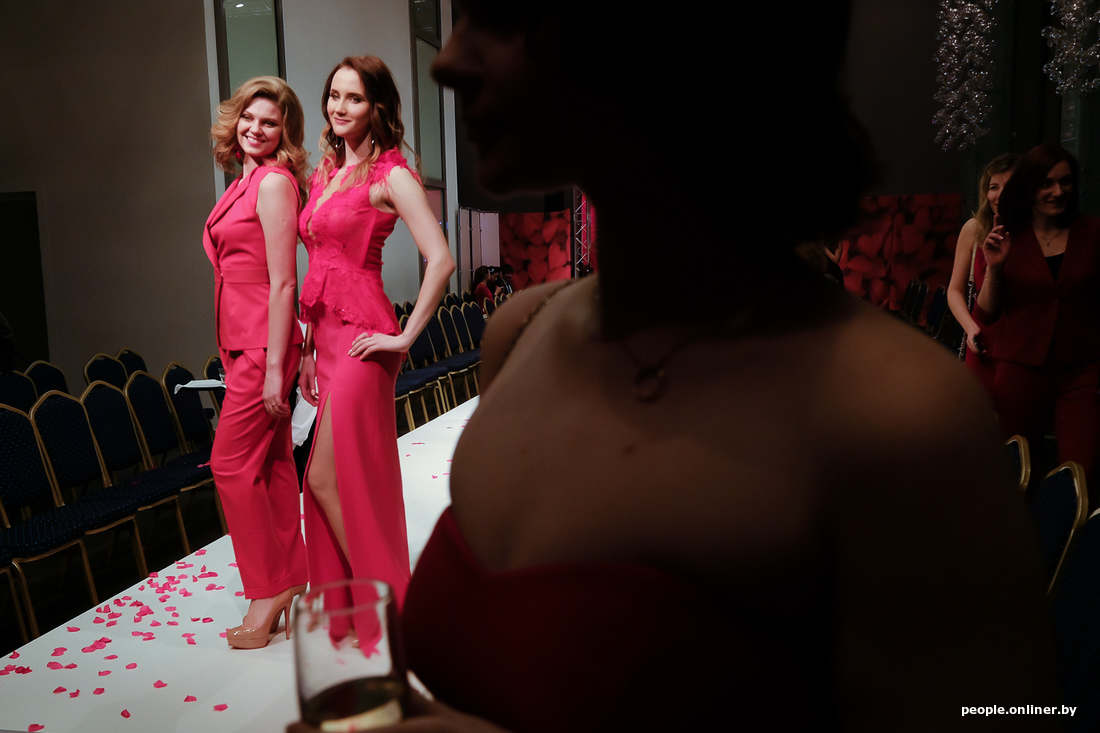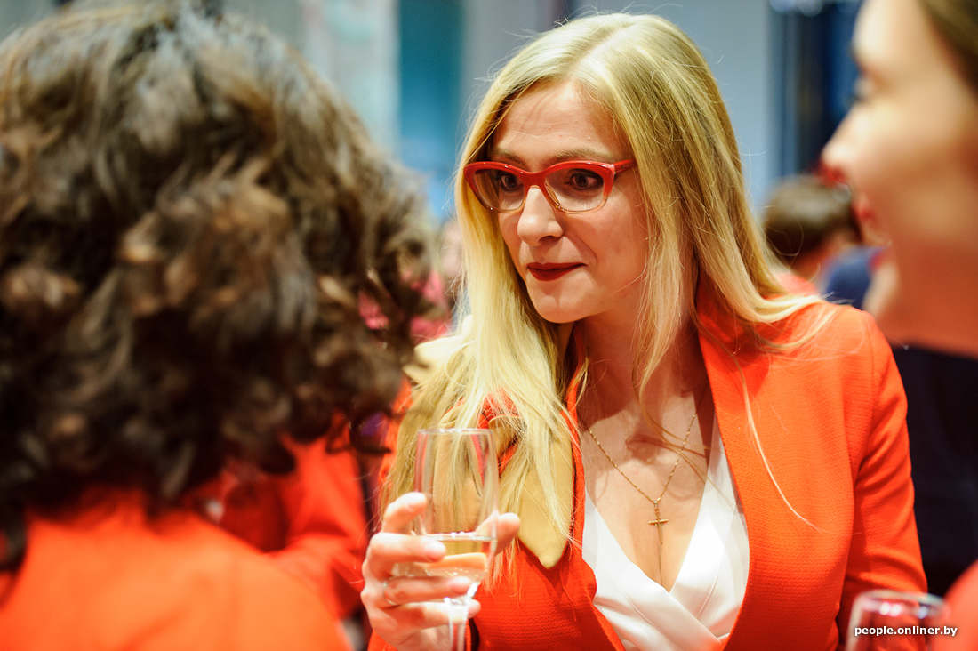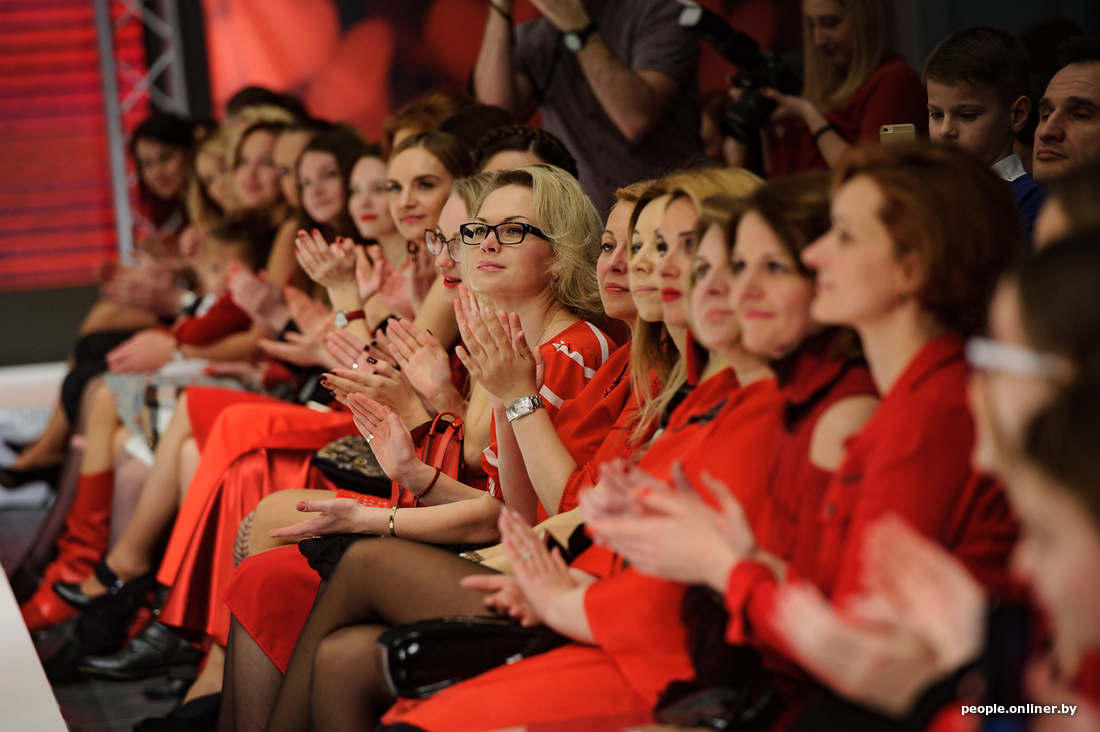 Тем временем на сцене появляются главные героини вечера — известные белоруски в красных платьях. Выборка медиаперсон совершенно разнородная: здесь и посол Великобритании Фионна Гибб, и баскетболистка клуба «Цмокi-Мiнск» Диана Сизонова, и «Мисс Беларусь» Василиса Рымжа, и прима-балерина Большого театра Ольга Гайко — всего 20 женщин в вечерних платьях. Самый строгий наряд был, пожалуй, у госпожи посла — в национальном шотландском стиле.