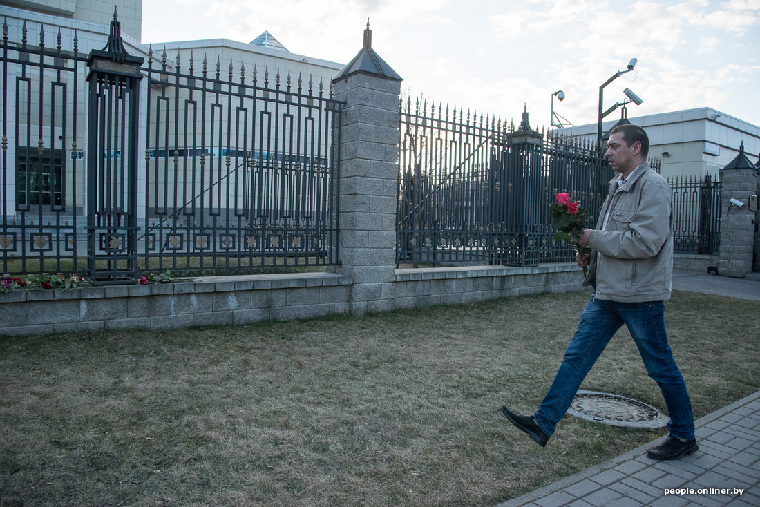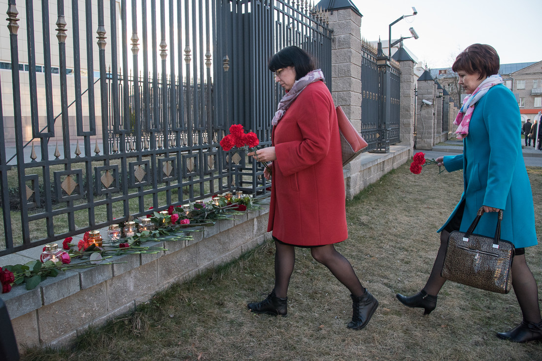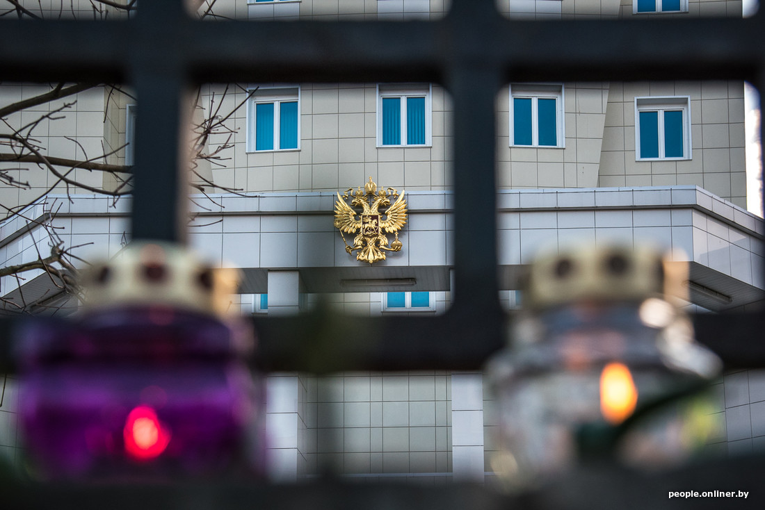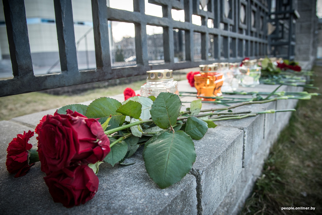 А к посольству России в Беларуси минчане приносят цветы, чтобы выразить соболезнования семьям погибших.