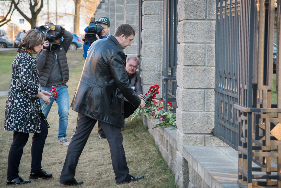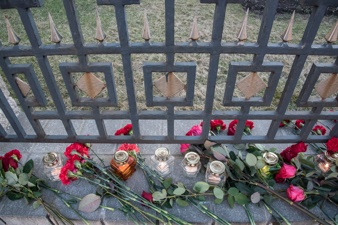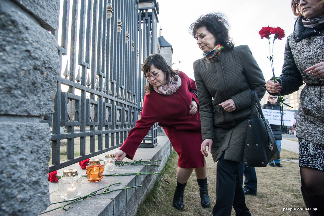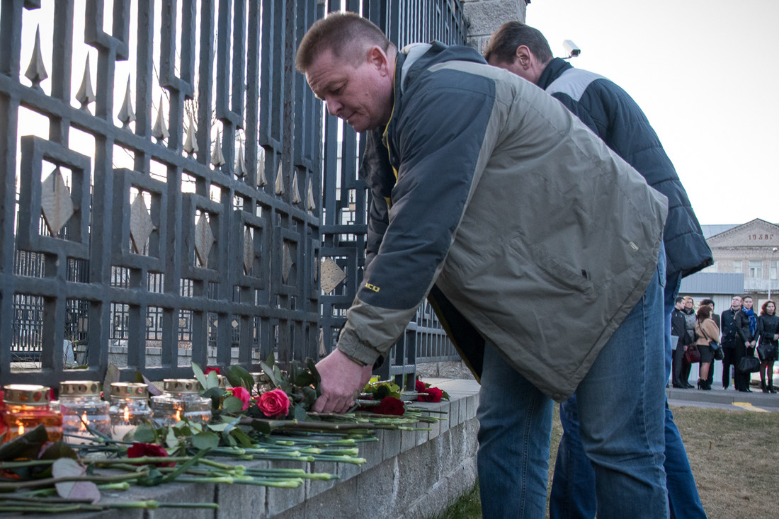 А к посольству России в Беларуси минчане приносят цветы, чтобы выразить соболезнования семьям погибших.