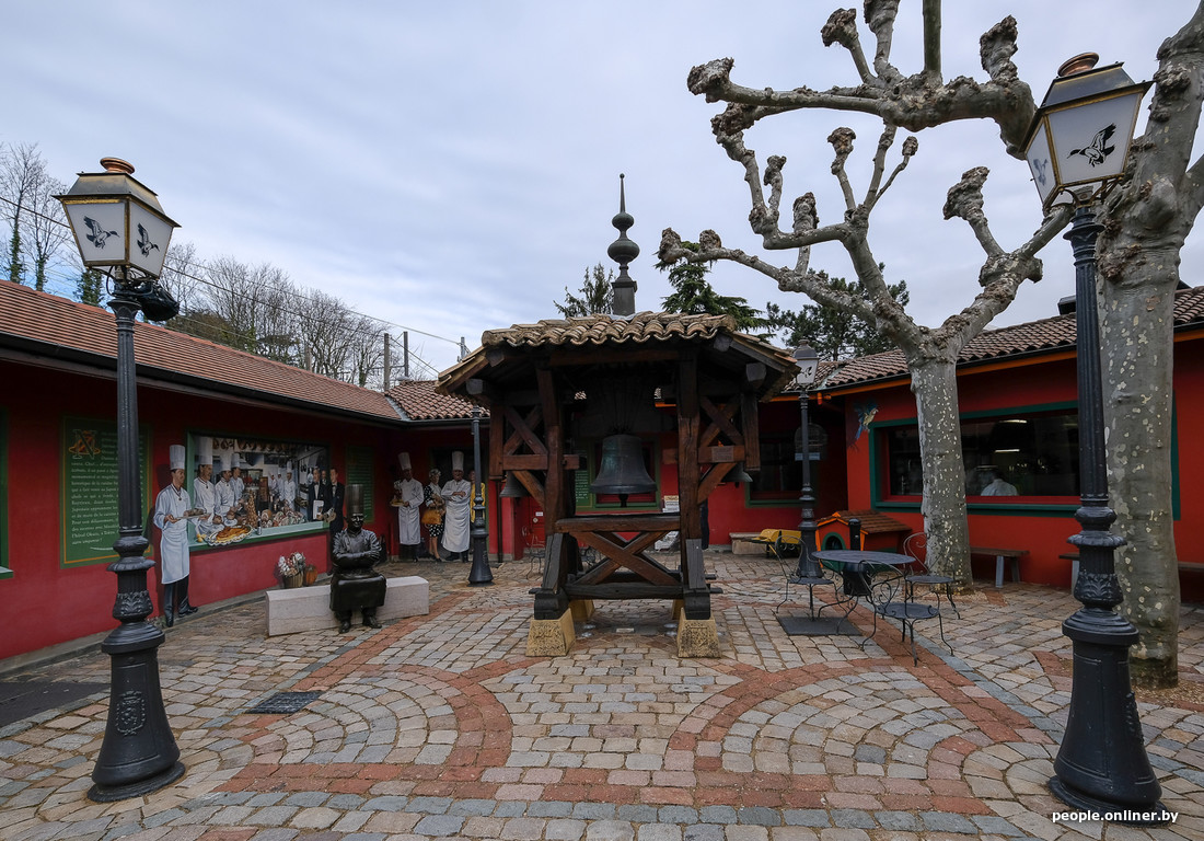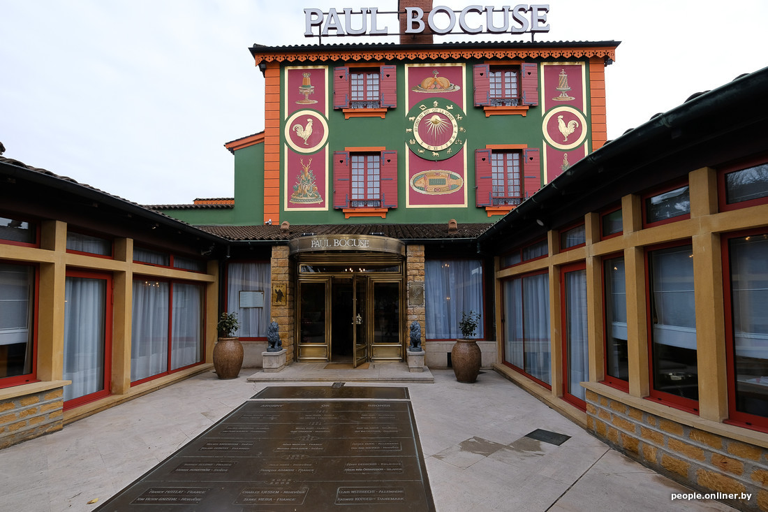 Главный ресторан Бокюза в Коллонж-о-Мон-д’Ор рядом с Лионом. Обед здесь проходит с 12:00 до 13:30, ужин — с 20:00 до 21:30. Записаться можно по интернету. Мы не отважились расстаться с парой сотен евро, но побродили рядом, заглянули в меню, пустили слюни.