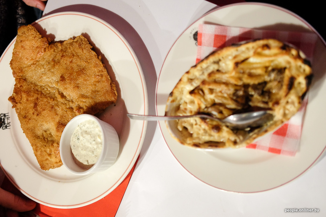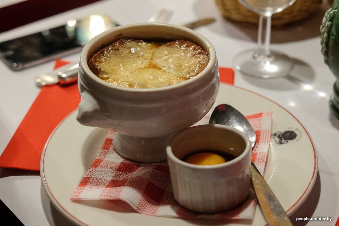 В настоящем бушоне тесно — можно с трудом протиснуться мимо сидящих рядом посетителей. Официант приносит меню на французском, через 10 минут — на английском. Он никуда не спешит, лишь бросает удивленные взгляды: чего эти типы не взяли аперитив, не заказали вина? Мужчина напротив пьет кофе, делая по глотку в 300 секунд.