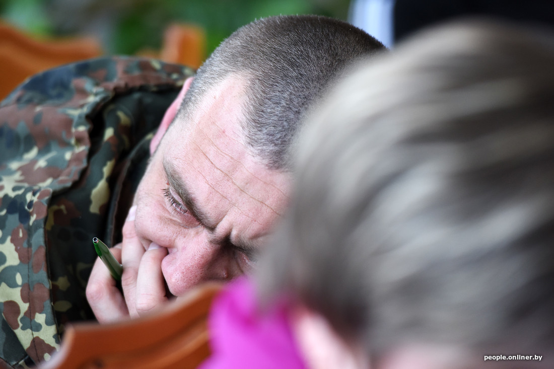 — Эх, я ж уже старый… — огорчен мужчина в кожанке, который только что собирался в пастухи, но теперь хочет быть вальщиком. Записывается все же в пастухи.