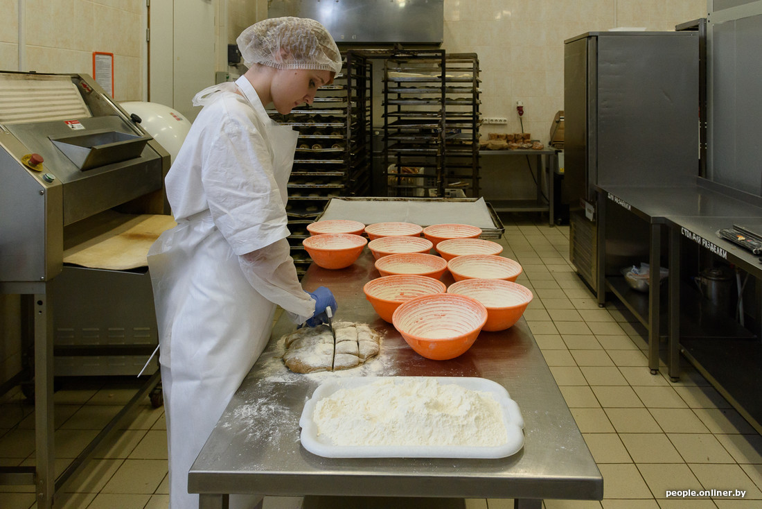 Входим в саму пекарню. От торгового зала ее отделяет ряд стеллажей с хлебом и печи. Эмпирическим путем доказано, что теплый хлеб продается в разы быстрее. Поэтому пекарь приходит в магазин первым — в 6:30.