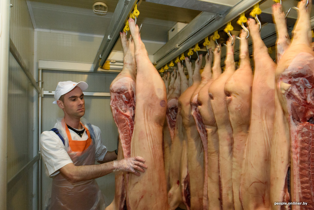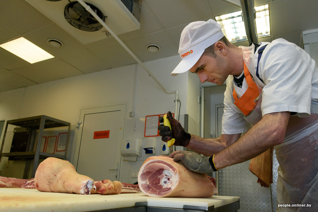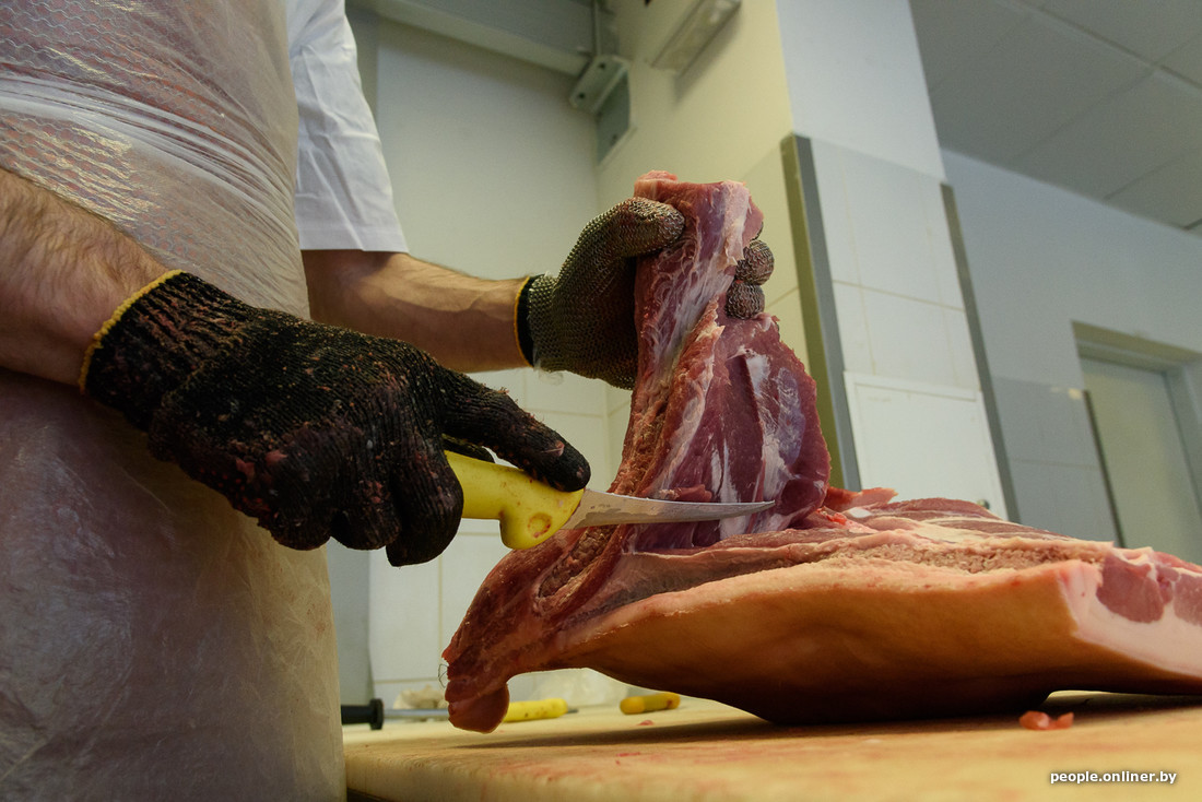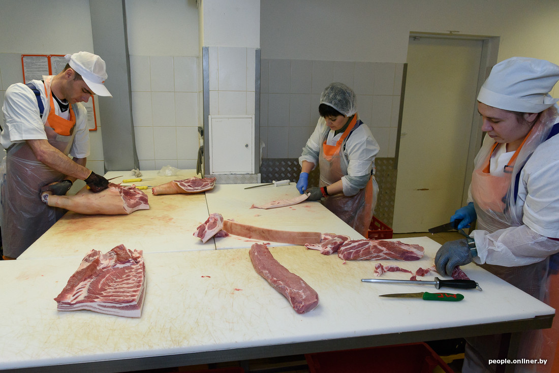 Из холодильника через мойку полутуша поступает в руки обвальщика (тот режет ее на нужные куски) и жиловщиц (несложно догадаться, что снимают они). Судя по скорости работы, полутуша превращается в полуфабрикаты за пять минут.