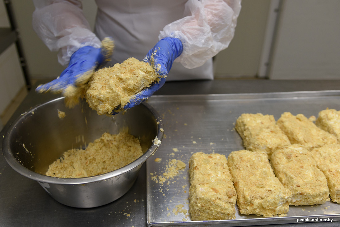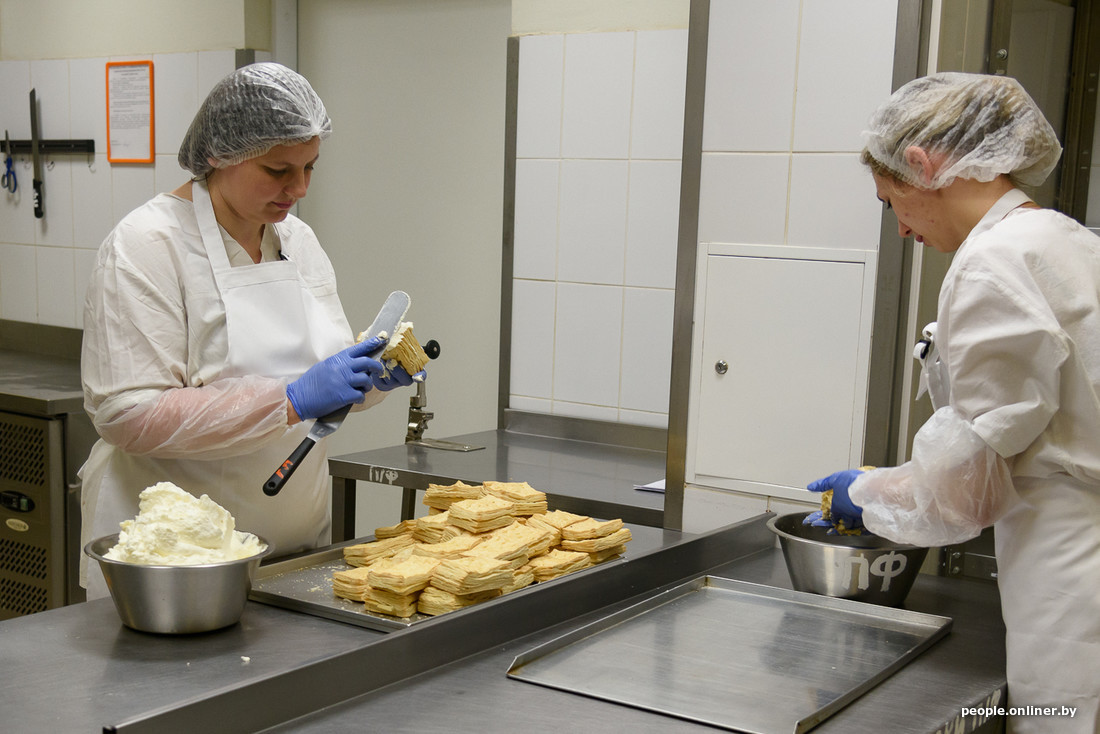 Сотрудники рядом мажут сливками слойки, которые позже назовут «Наполеоном». И «фаршируют» кремом заварные пирожные.