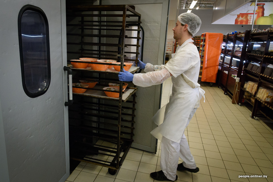 — Ночью прилавки пустые, вымытые, — говорит Павел. — Утром сотрудники начинают работать по новому производственному заданию, а также достают из холодильника товарный запас — при условии, что сроки его годности не истекли. Напомню, шашлык, к примеру, годен 24 часа.
