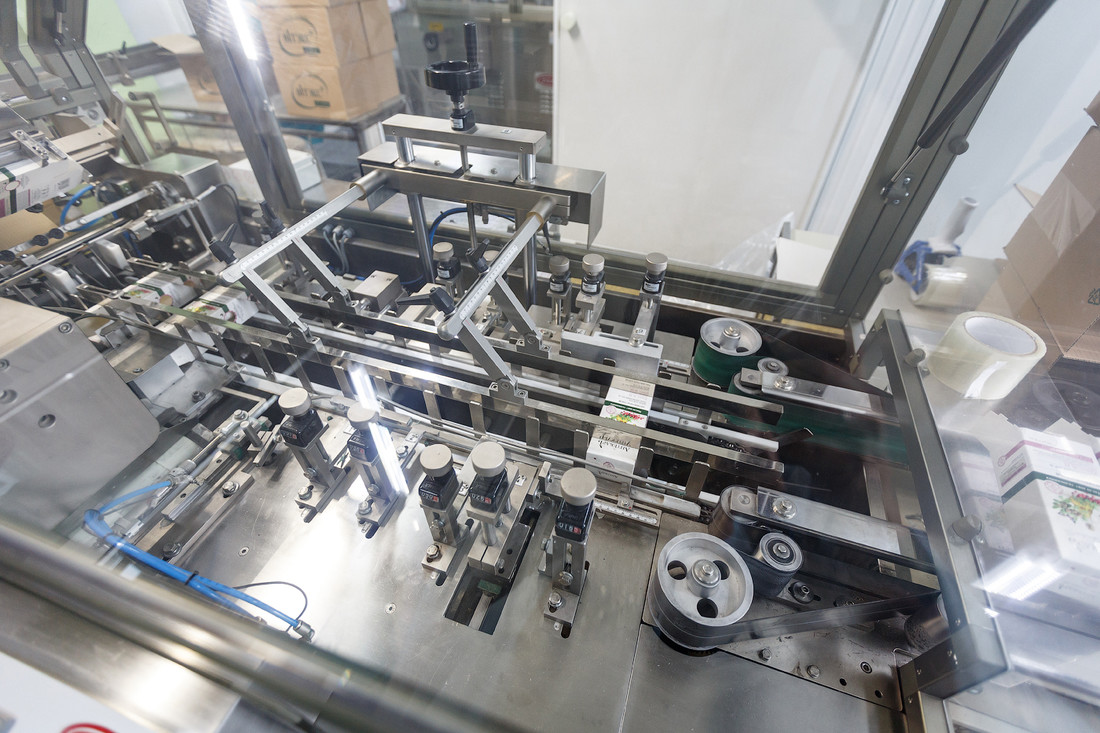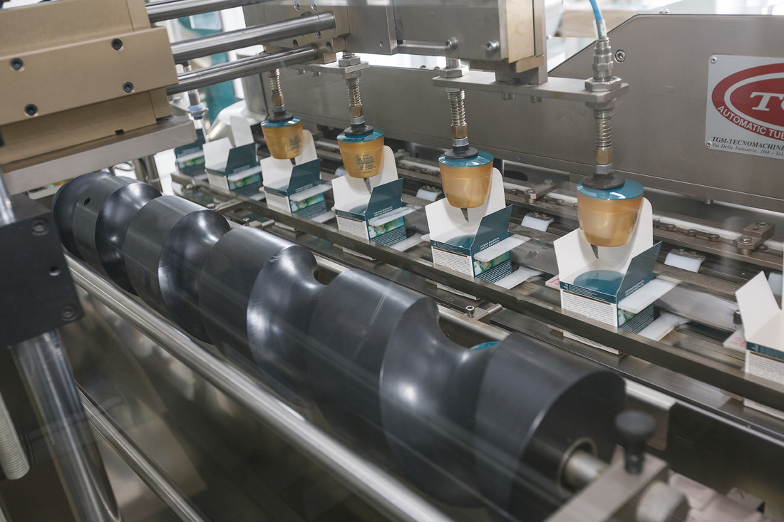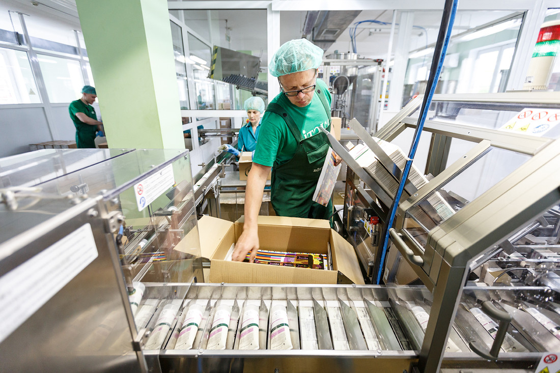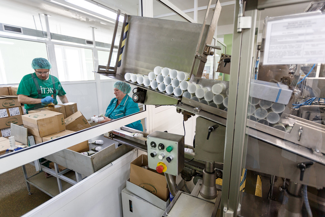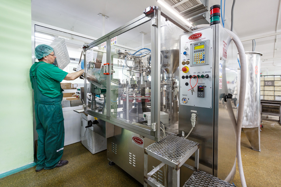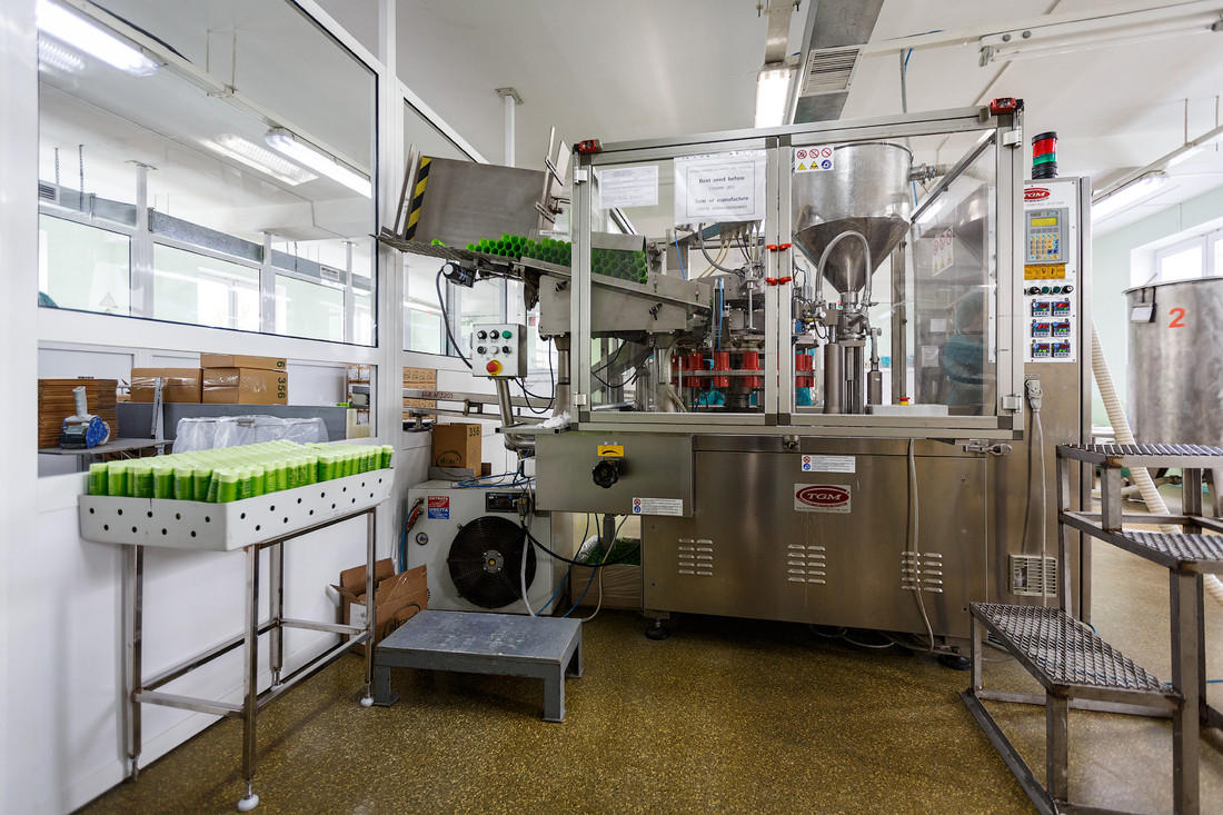 Тубные машины спаивают один конец тюбика и маркируют датой изготовления на шве. Уже после этого работницы проверяют и пакуют продукцию в большие картонные коробки.