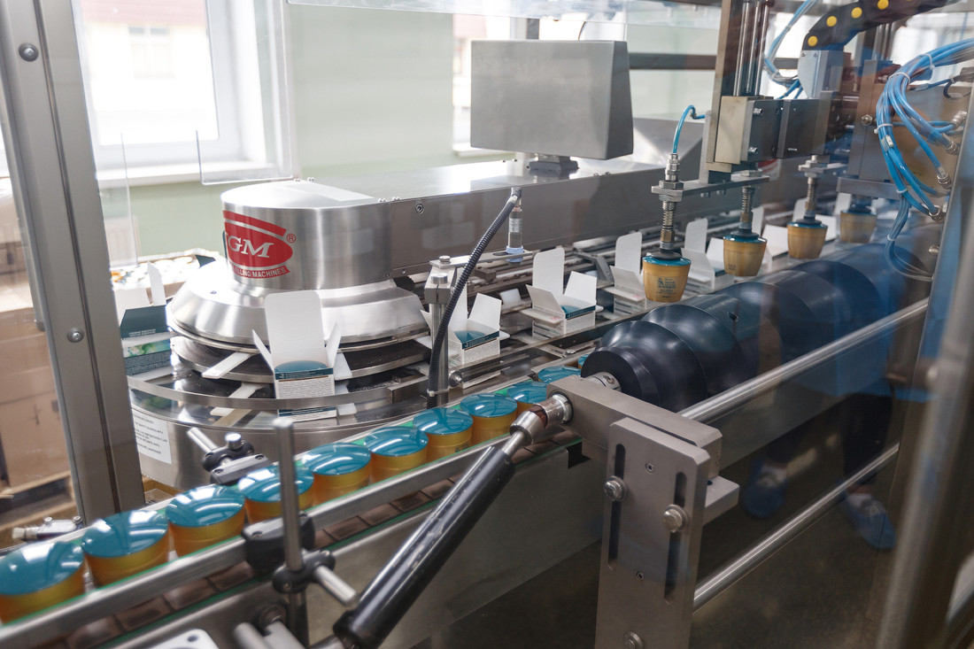 На другой линии робот разливает в банки крем, накладывает фольгу, закручивает крышки и упаковывает в коробку, а в конце оборачивает ее целлофаном.