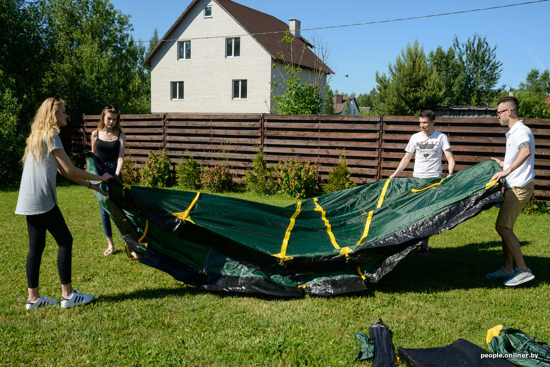 — Весит как полкота, мне так проще оценить. Кот — это 6 килограммов. Значит, палатка — 3—4, — рассуждает Полина, держа в руках собранный комплект.