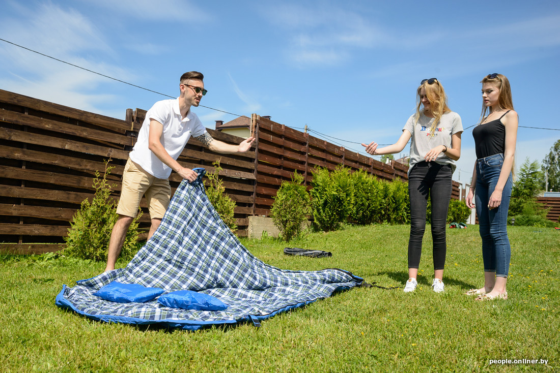 Наши звезды — Вероника, Полина и Александр — никакие не суровые туристы. Поэтому сегодня в тепличных условиях коттеджного участка они впервые столкнутся со многими вещами. Например с тем, как ставить палатку.