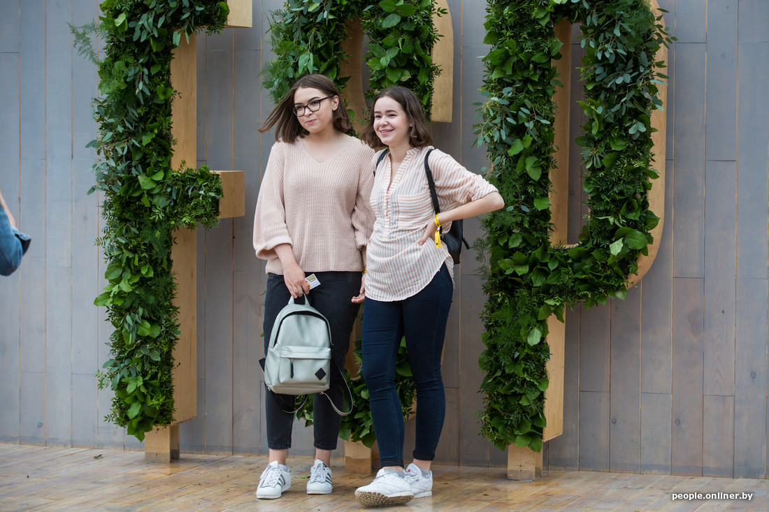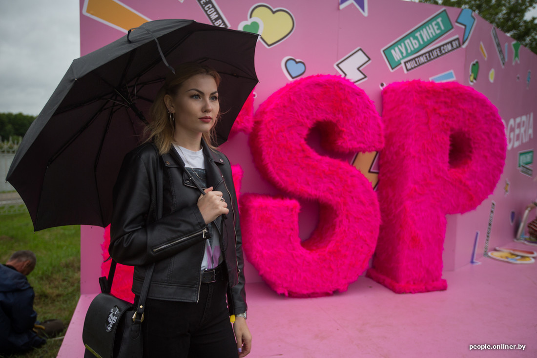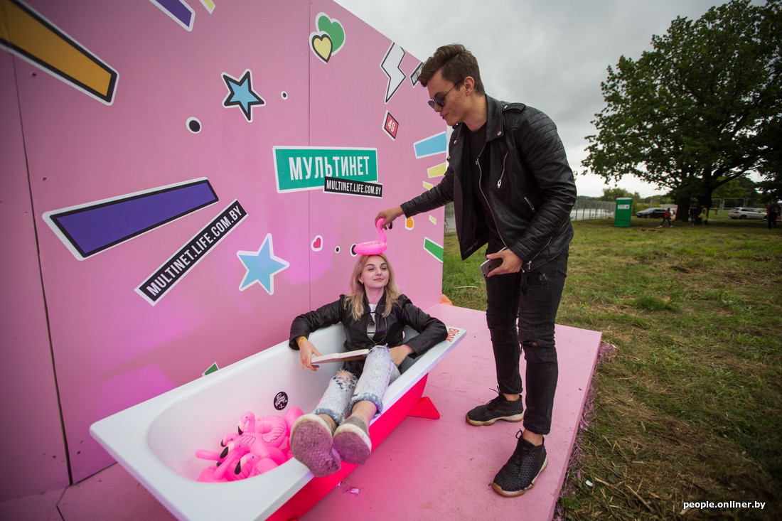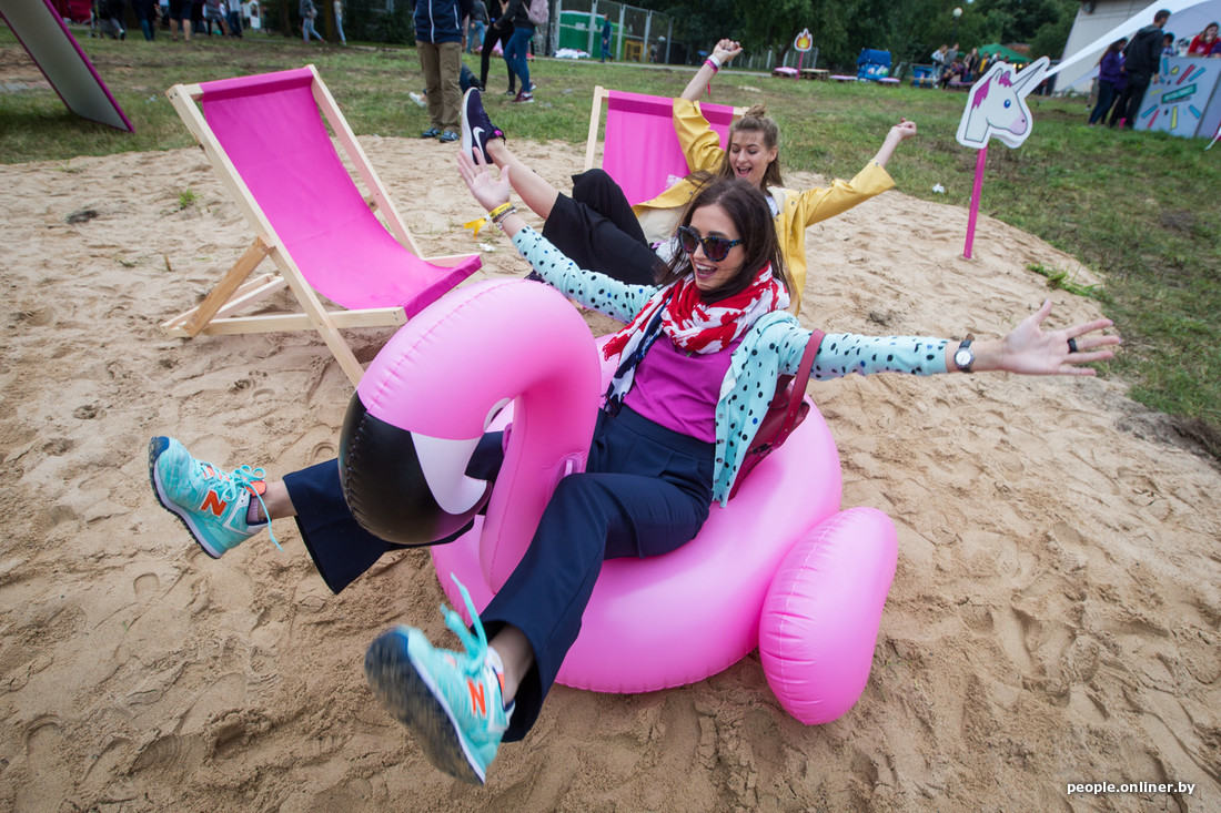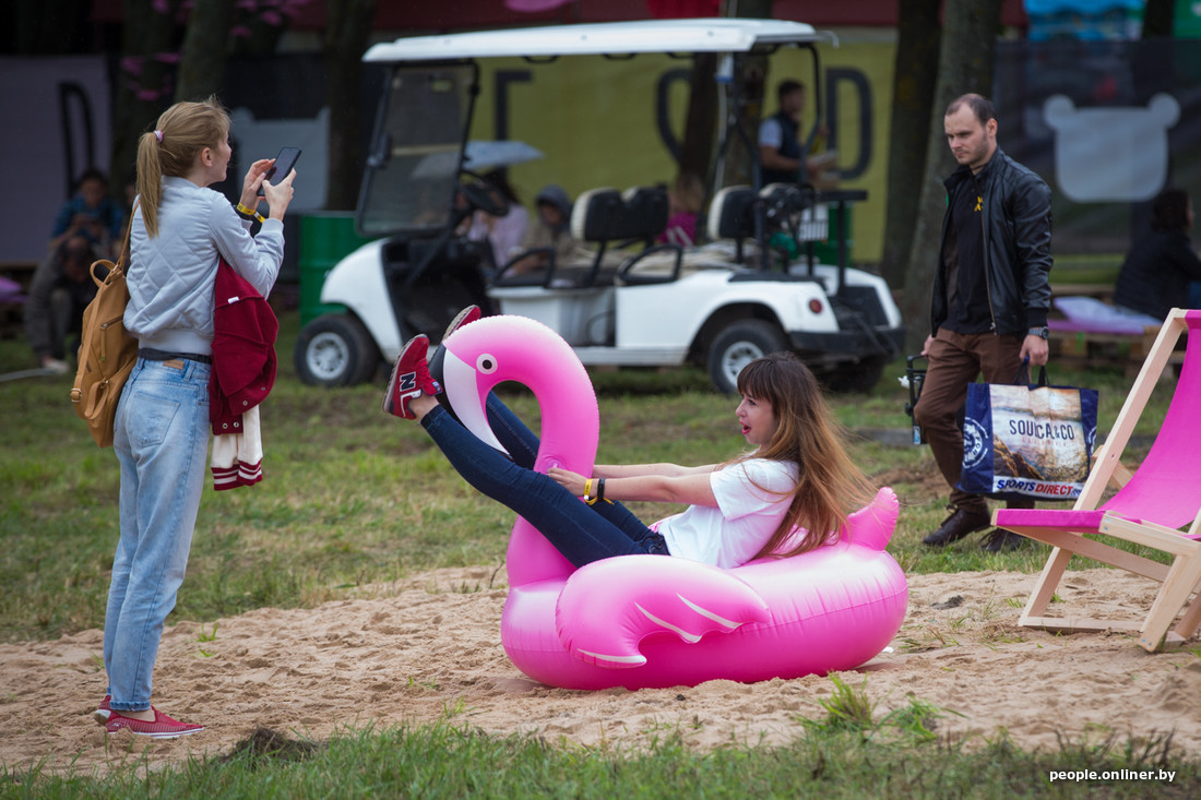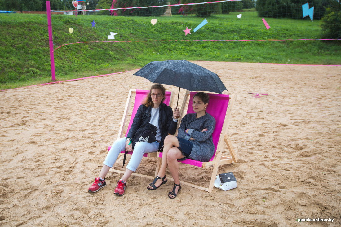 Тем временем грустно мокли розовые шезлонги на желтеньком песке — именно так организаторы оформили фотозону для Blogeria. «Здравствуйте, я блогер!» — напрашивались в объектив к фотографу Onliner.by юные поклонники Влада Бумаги.