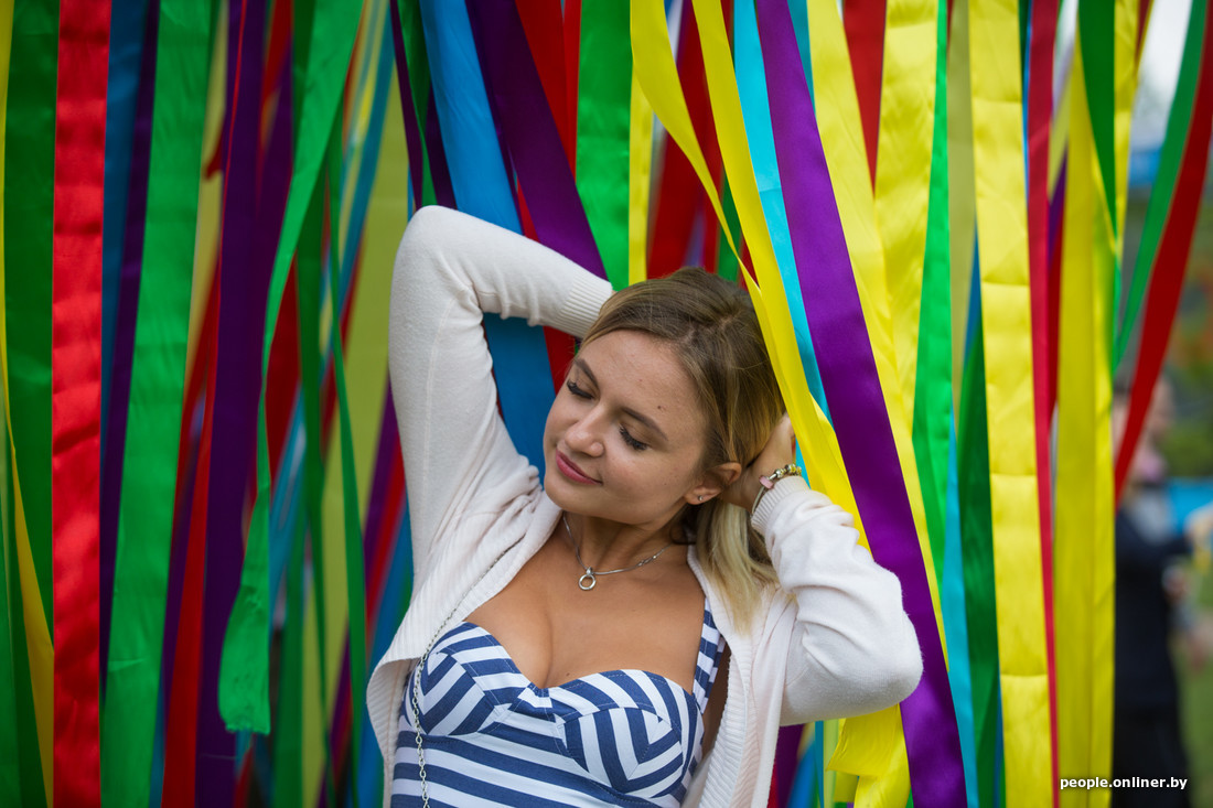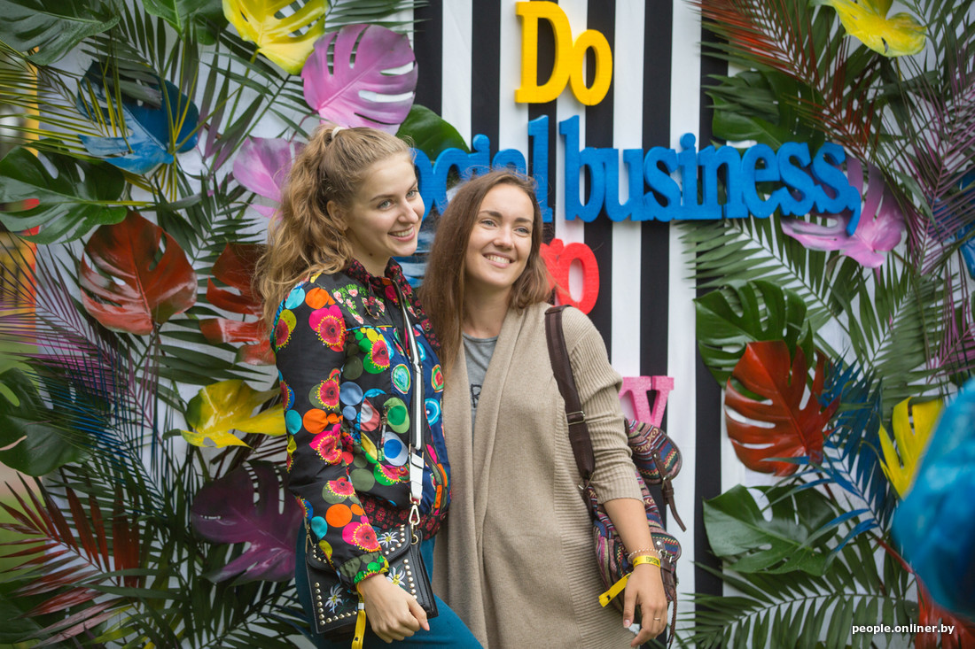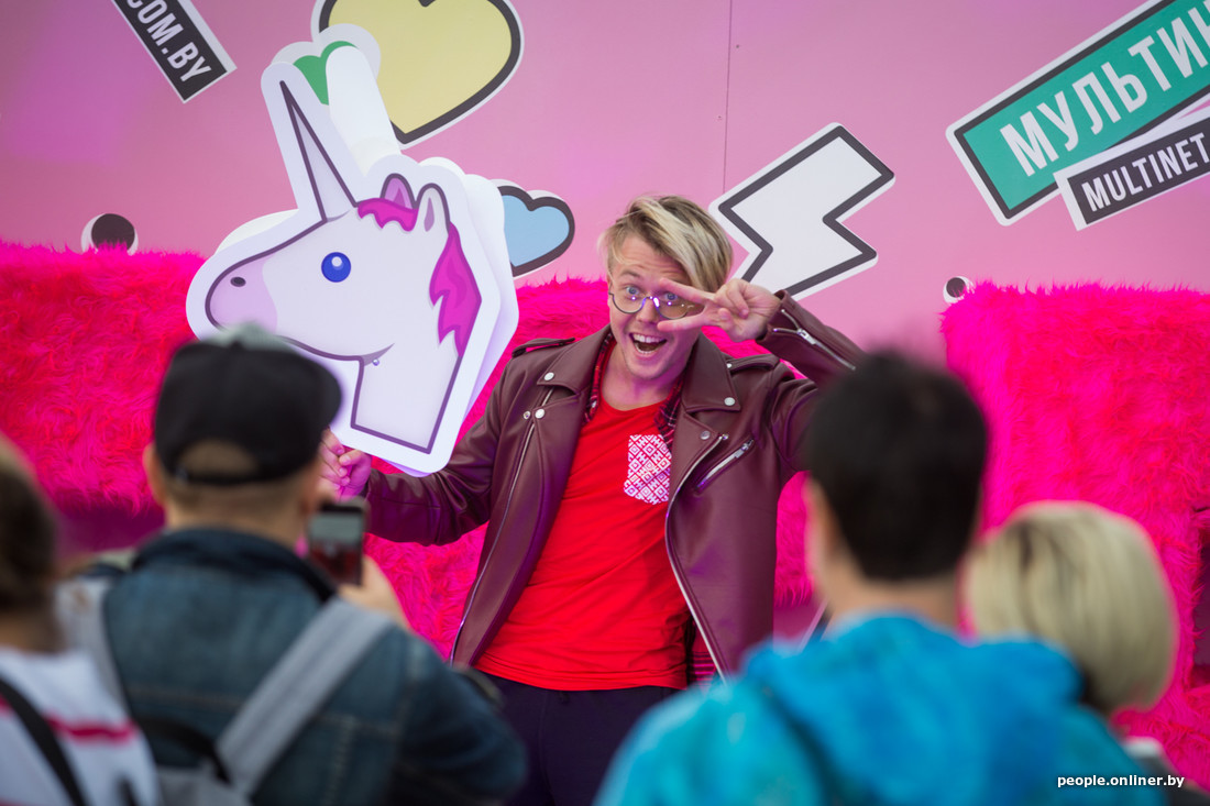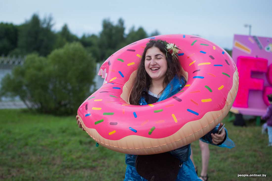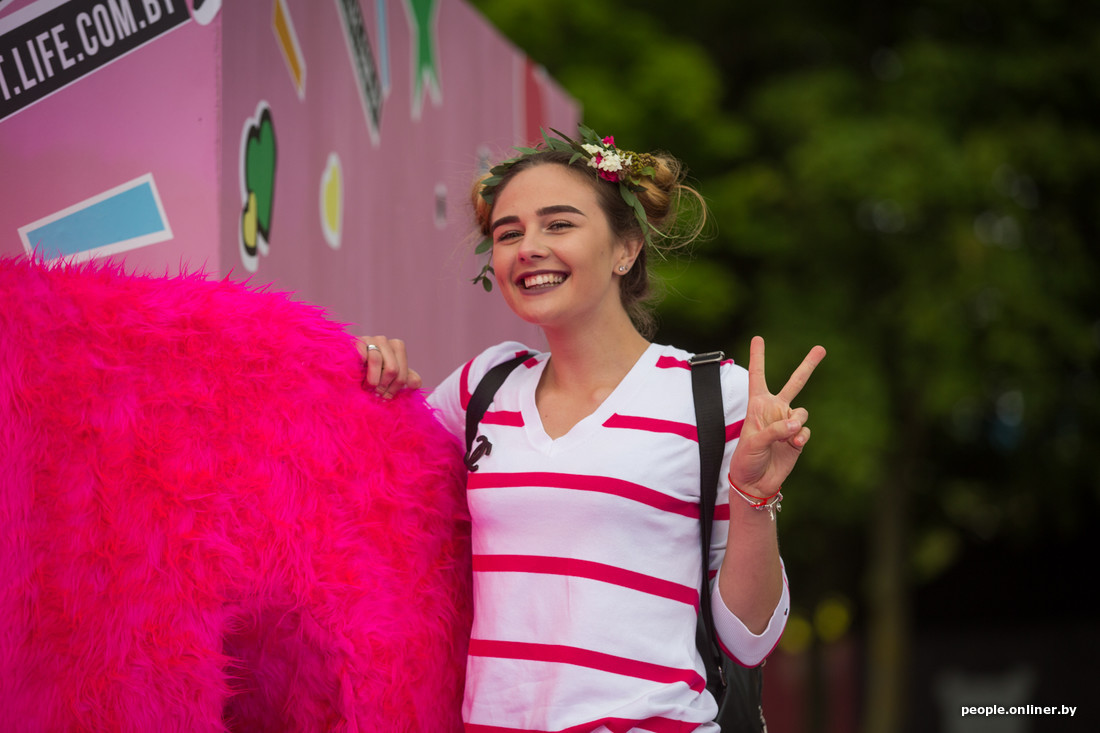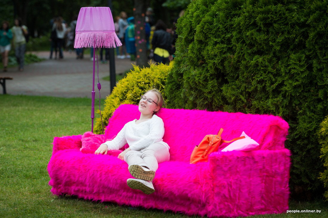 Тем временем грустно мокли розовые шезлонги на желтеньком песке — именно так организаторы оформили фотозону для Blogeria. «Здравствуйте, я блогер!» — напрашивались в объектив к фотографу Onliner.by юные поклонники Влада Бумаги.
