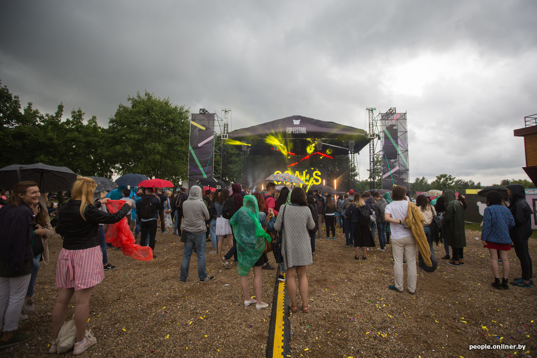 Очередь к зеленому мохнатому логотипу FSP не редеет: страсть юных девушек к селфи не зависит от геопогодных условий. К тому же организаторы предусмотрели массовую продажу дождевиков: 2 рубля — и гарант непромокаемости в ваших руках.
