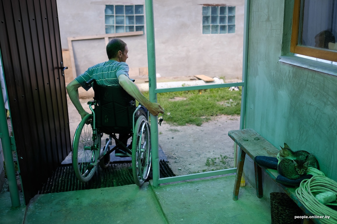 — Я пытался стать на ноги, пойти. И пытаюсь до сих пор. Помню, в Аксаковщине (реабилитационном центре. — Прим. Onliner.by) врачи на меня посмотрели, увидели, как я сижу, стою, делаю мостик и сказали: «При такой травме это невозможно!» А я не сдавался. Как домой вернулся, стоял по часу-два у забора, тренировался. Купил фиксирующие ортезы, шагал с ходунками. Метров пятьдесят мог пройтись по ровному полу. Но если чуть где ямочка — все, сразу падал. Уже и ортезы эти поломались. А где ж ты найдешь на все грошы?.. С колясками в Беларуси беда. Я купил себе импортную за собственные деньги. Те, что бесплатно предлагают в Минске, то ли отцентрированы плохо, то ли еще что, но на них неудобно ездить. Мне облегченная «активная» коляска не подходит, я же по огороду туда-сюда езжу, все контролирую по хозяйству. Раньше в доме были большие пороги — я научился их перескакивать. Вот здесь был самый высокий порог, — хозяин хлопает по кухонной двери. — Иногда, бывало, переворачивался в коляске. А что тут такого? Перекинул ее через порог, переполз, сел — да и все… Надежда пойти у меня и сейчас есть. Надежда, как говорится, умирает последней. Нужны тренажеры — а это опять деньги.
