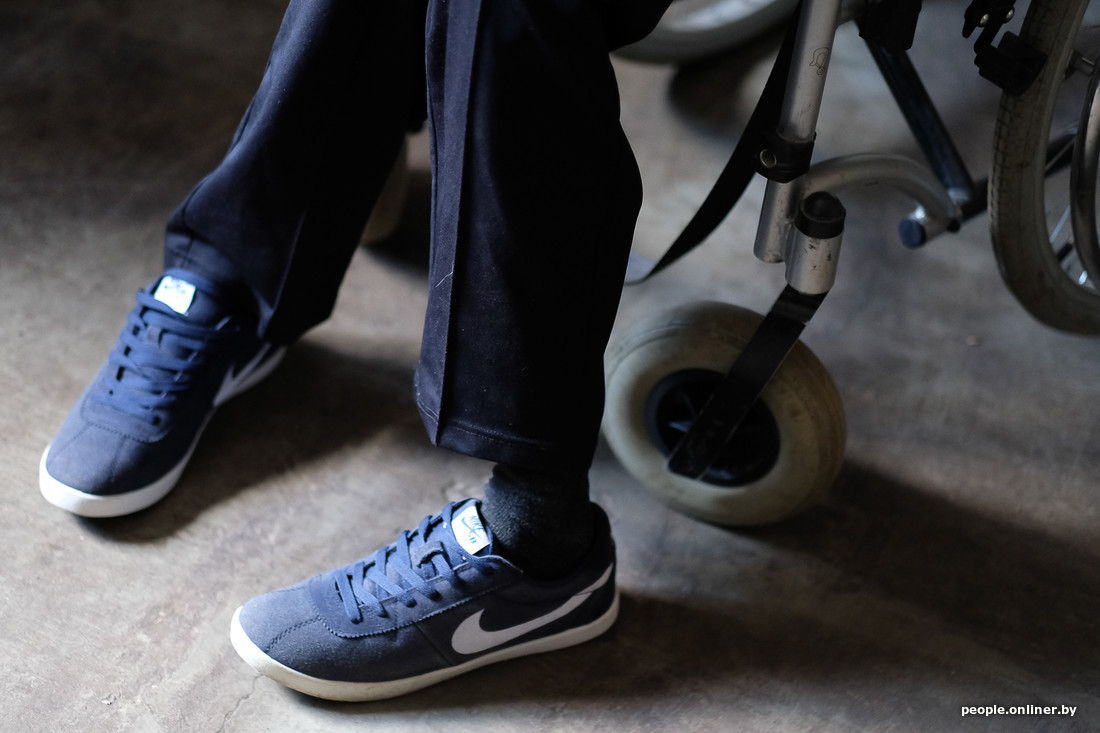— Кроме кроссовок, ничего другого обуть я не могу, — говорит обладатель 41-го размера. — Зимняя обувь должна быть по щиколотку, ведь в коляске я специально убрал подножки, чтобы разрабатывать стопы. Если я надену сапоги с высоким голенищем, нога не станет. Зато с помощью этих шлеек разработались мои ноги! Первую коляску, в которую я сел, мне подарил кум. Уж не знаю, где он ее взял, но коляска была без подножек. Я придумал эти шлейки и постоянно так ездил — ноги и разработались. Еще помогла реабилитация в гомельском госпитале, в Новобелице. Я раньше в госпиталь ездил, а теперь перестал: некогда.