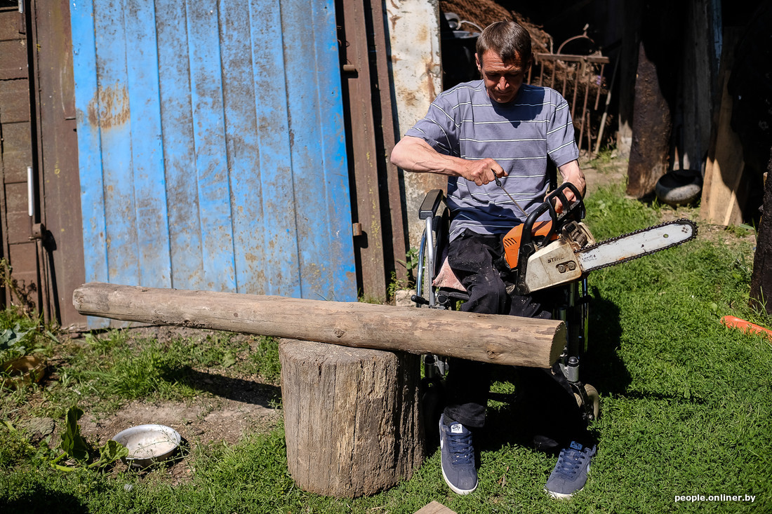 — Да боже мой, если честно сказать, какая может быть депрессия в деревне? В городе — да. Из квартиры даже не выедешь. А в деревне — то одно, то другое, голова забита делами, совсем про другое думаешь. Я после травмы делаю все то же, что и раньше. Даже больше. Когда был здоровый, работал в колхозе, а дома не было ни на что времени. А когда сел в коляску, начал ремонт делать, хозяйство завел. Коровку одну купил, та телочку привела… Качки, свиньи, куры. Сам научился косить ручной косой, сам дрова бензопилой пилю, когда нужно полоть огород — людей прошу, помогают. Ну а если хозяйство не держать, самому не работать, разве выживешь за 220 рублей? Это вся моя пенсия, а у меня еще жена и двое детей: Никите 17 лет, Ксюше — 11. Правда, какой-то спонсор из Германии мне иногда пересылает по 10 евро…