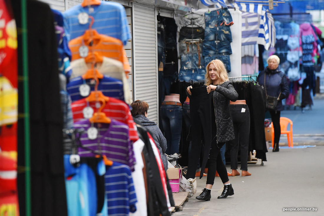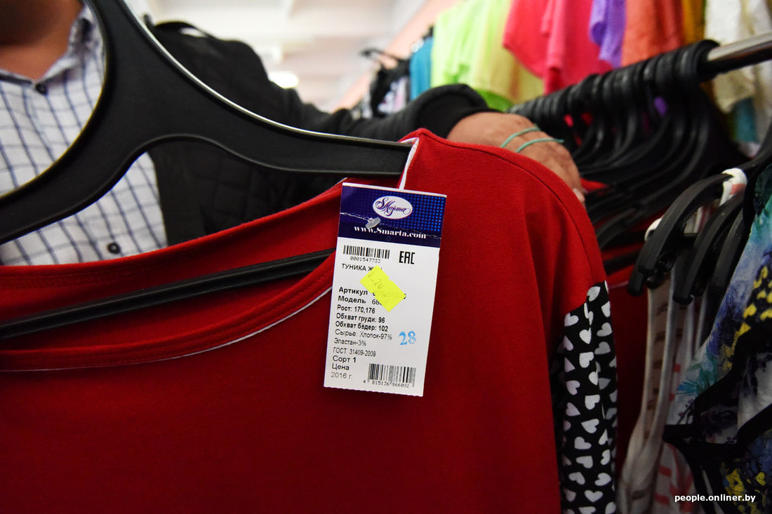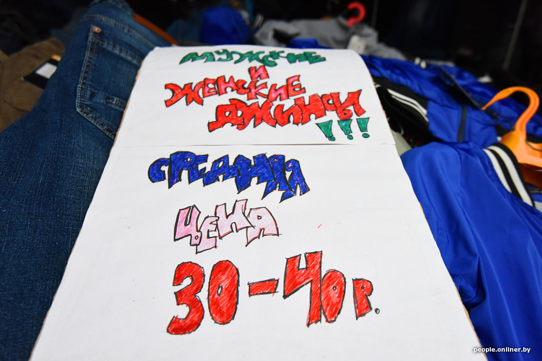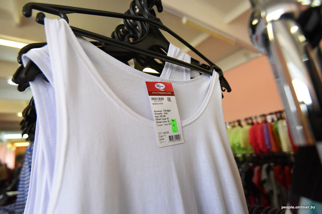 Внутри ничего лишнего, только вешалки с одеждой да стол с небольшим кассовым аппаратом, как в маршрутке. За обстановкой наблюдает молодой узбек, с десяток белорусов перебирают одежду. Майки, штаны, куртки щедро увешаны ярлыками на любой вкус. Такое ощущение, что тут недавно прошлась мощная проверка, оставив кучу предписаний.