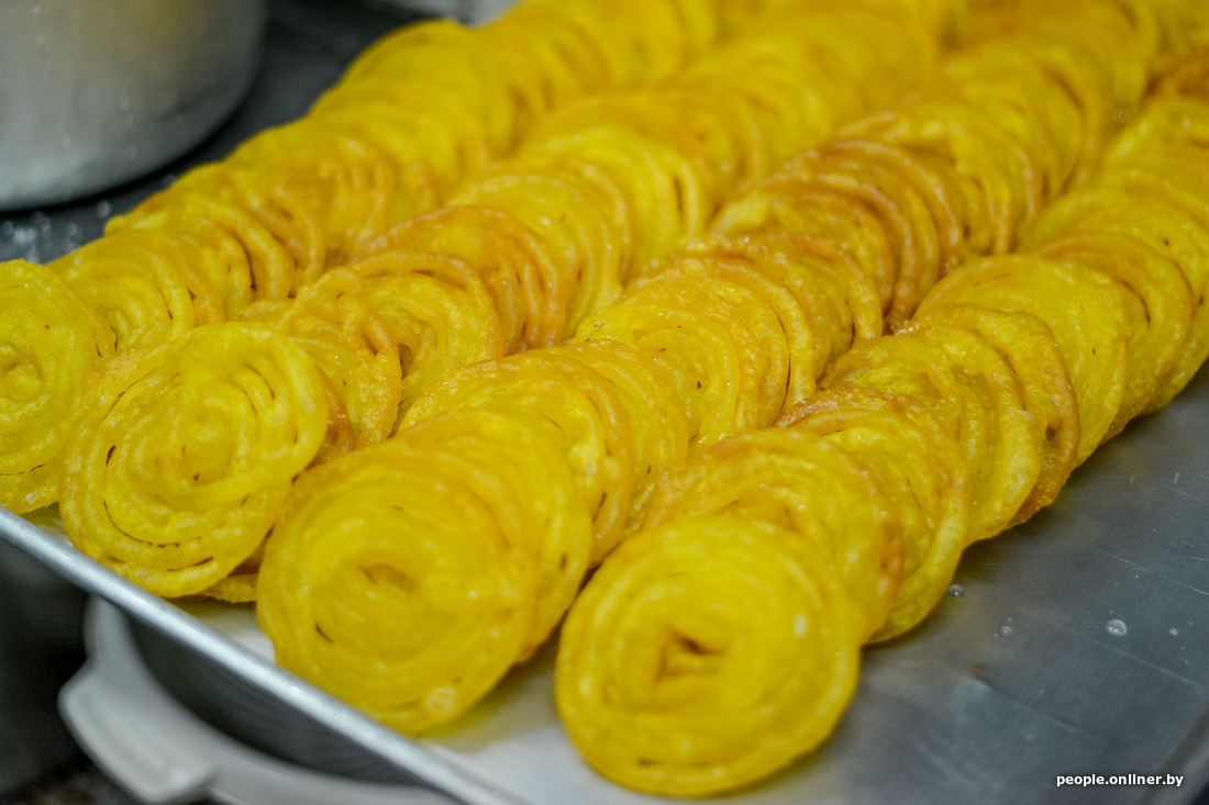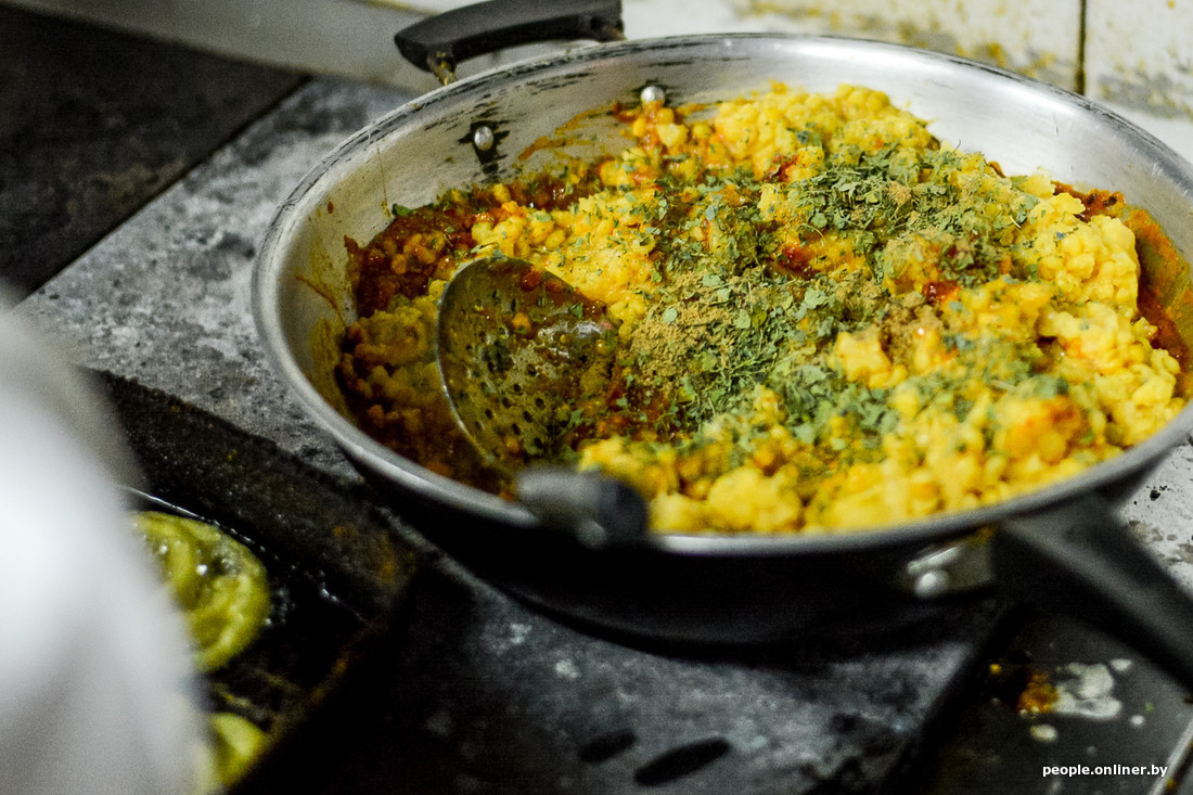 Владелец заведения ведет нас на кухню, где жарятся джелеби — индийские сладости-спиральки из нутовой муки. Кроме Бикаша, здесь работают еще двое индийских поваров и один белорус. Они пекут индийские лепешки наан и чапати, готовят пирожки самоса и еще десятки различных блюд. Дважды в неделю Бикаш сам готовит для посетителей. Обычно это понедельник и вторник. На этот раз он делает дал — пряный суп-пюре из разваренных бобовых.