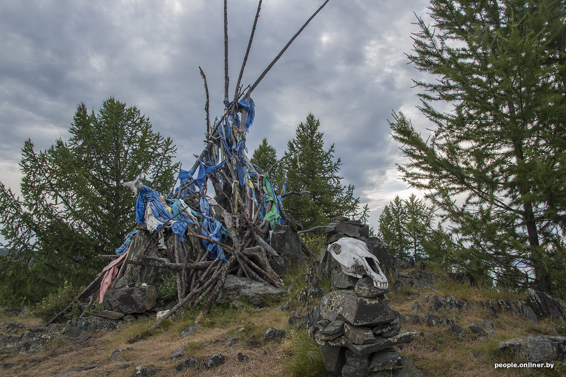 На следующий день мы махнули тридцатикилометровый пеший бросок к безлюдному и таинственному месту на озере. Мыс с расположенной на нем скалой словно являлись иллюстрацией к труду по этнографии. Черепа животных, ступы, чашки, бусы, цветные ленты — все свидетельствовало о нежелательности нашего присутствия там.