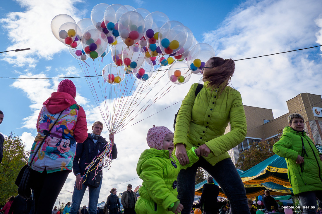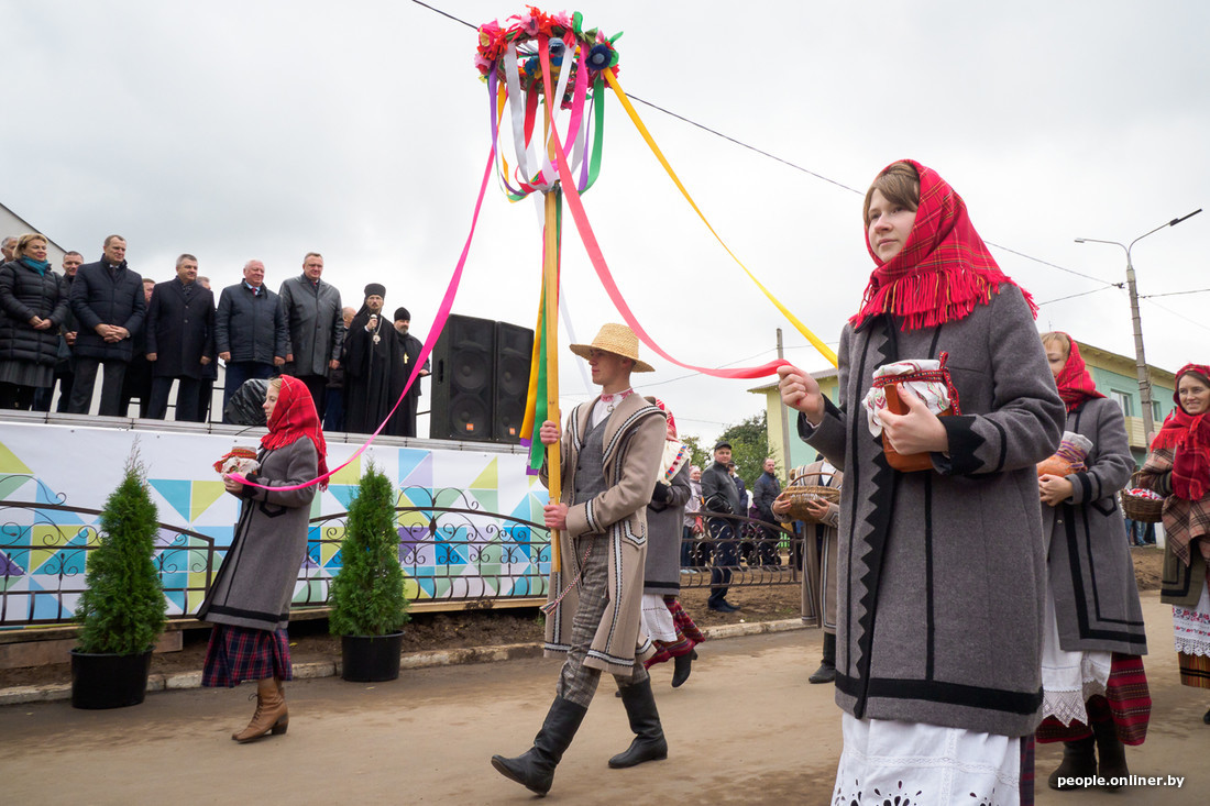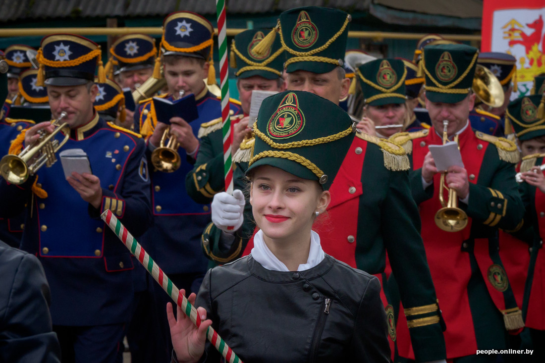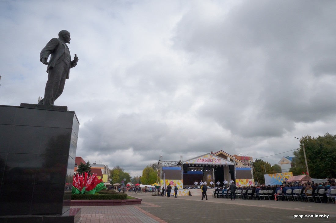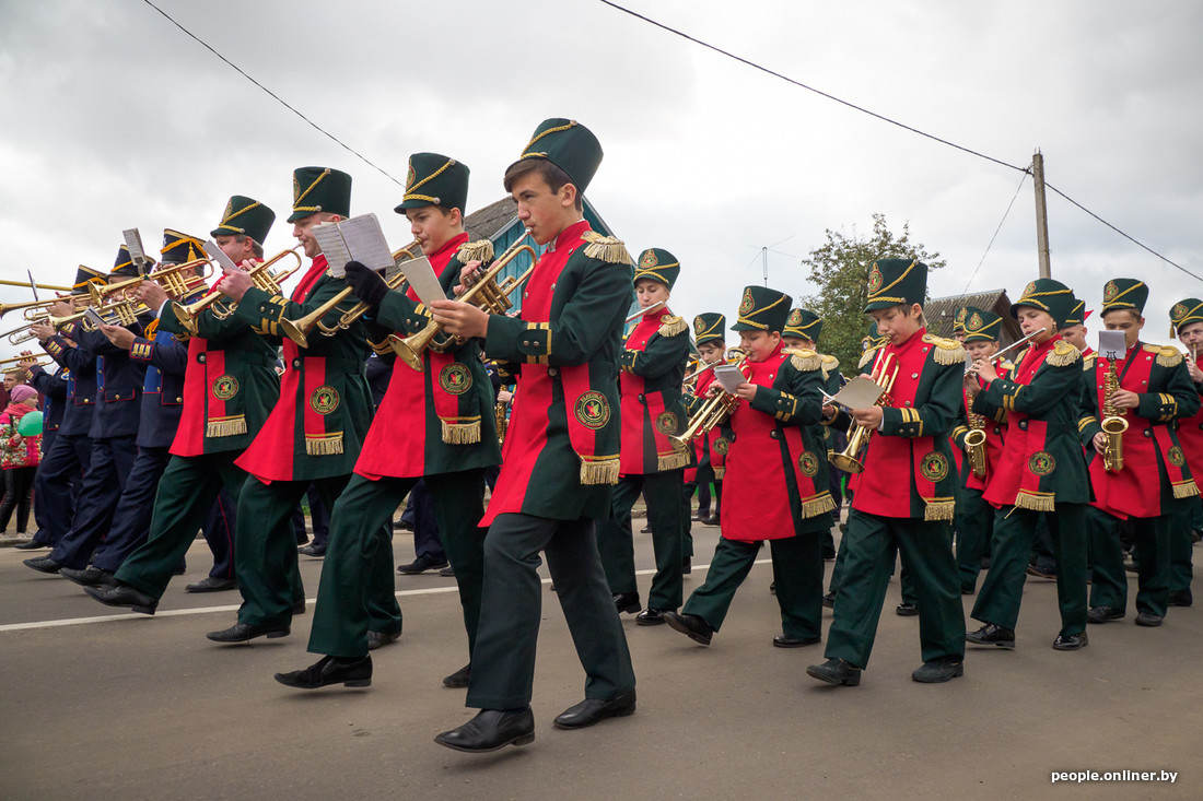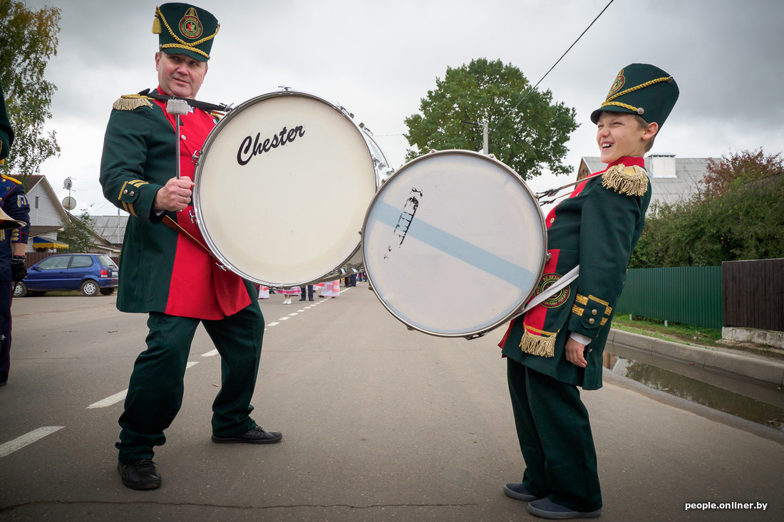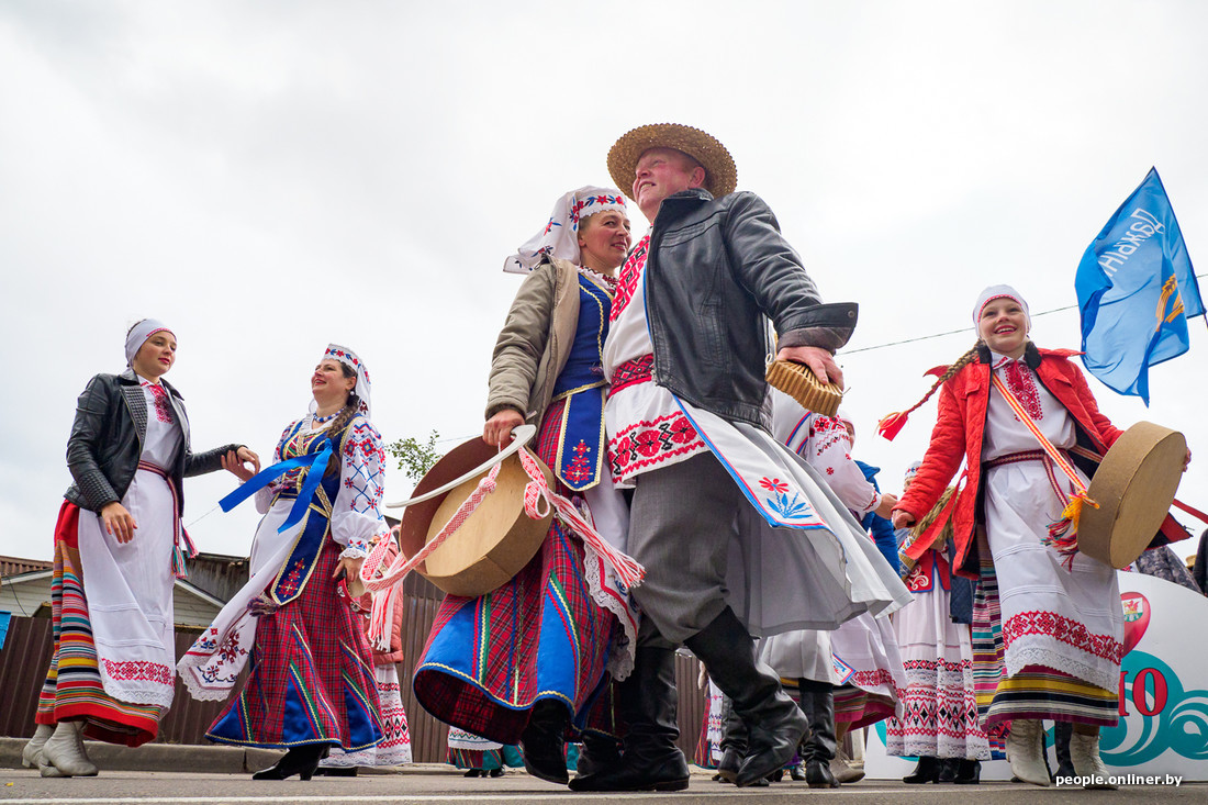 — Знаете, как наш город к «Дожинкам» готовился? Ого как. Два месяца все тут делали, плитку на тротуарах, фасады, в Доме культуры еще вчера окна вставляли. А какой райисполком классный, а загс новый, — хвастается мужчина с флажком «Белагропромбанка» и машет проходящей мимо колонне. На улице +6 и ветер. Надевшие короткие рваные джинсы школьницы кутаются в шарфы и делают селфи. Парни громко лопают шарики и дурачатся.