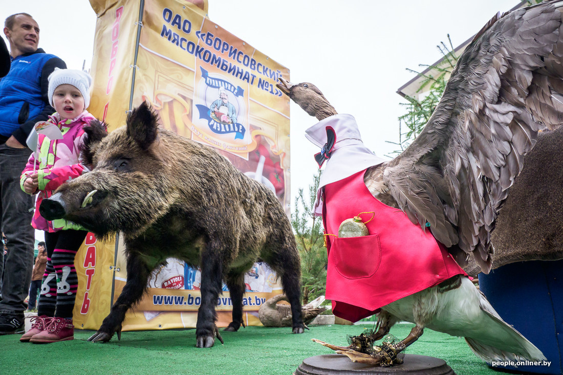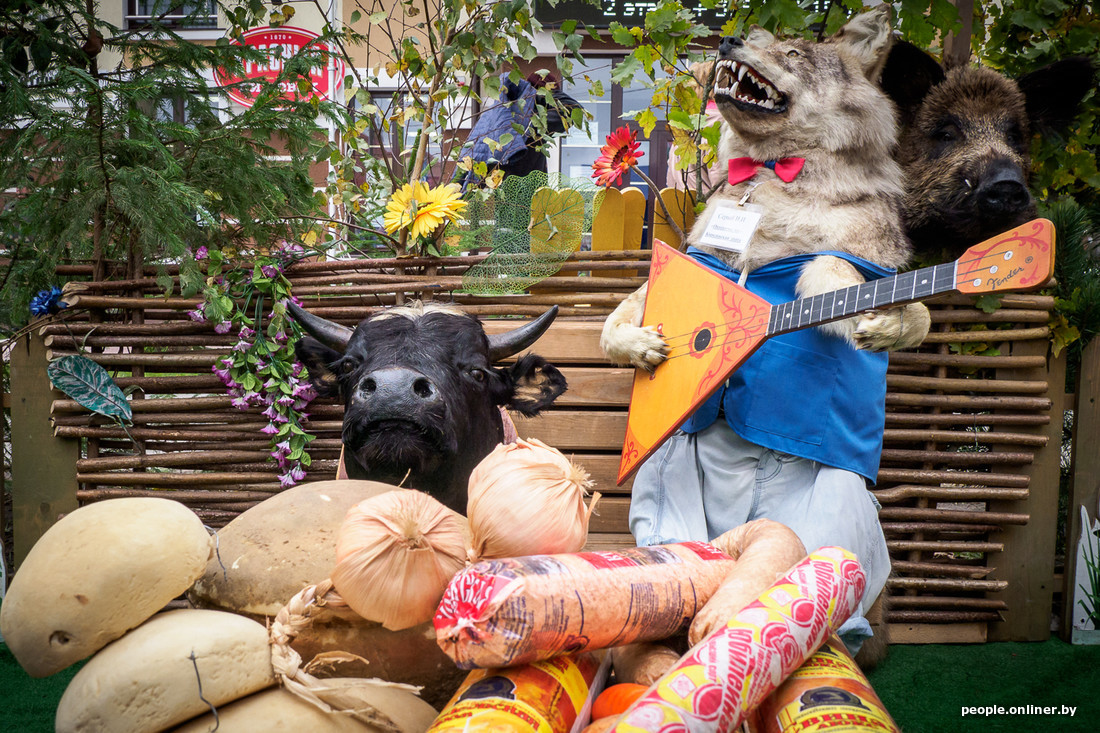 На входе в торговые ряды — охрана с металлоискателями и заграждения. Первыми встречают комбайнеров и механизаторов чучела животных — волка, лисы, медведя и кота с разноцветными глазами. Так неожиданно решил оформить палатку Борисовский мясокомбинат.