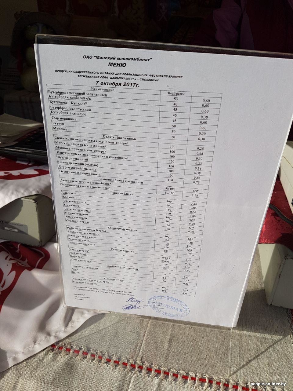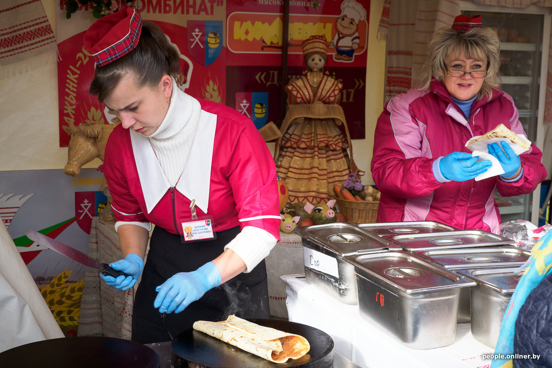 — А нужно что-то для «сугреву», иначе околеешь тут, — рассуждают продавцы агрокомбината «Ждановичи» и накладывают сало для дегустации. Угоститься бесплатно здесь предлагают всем — драники, блины, сало, квашеная капуста и огурцы. Мясокомбинаты угощают всех колбасой на фоне глобуса из сала, колбасного автомобиля и робота.