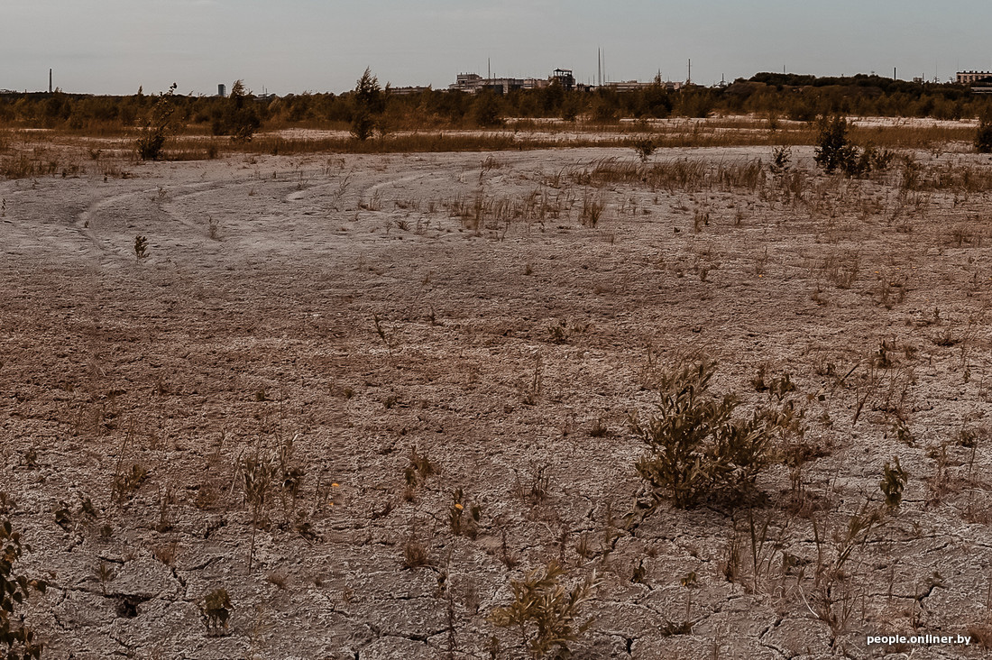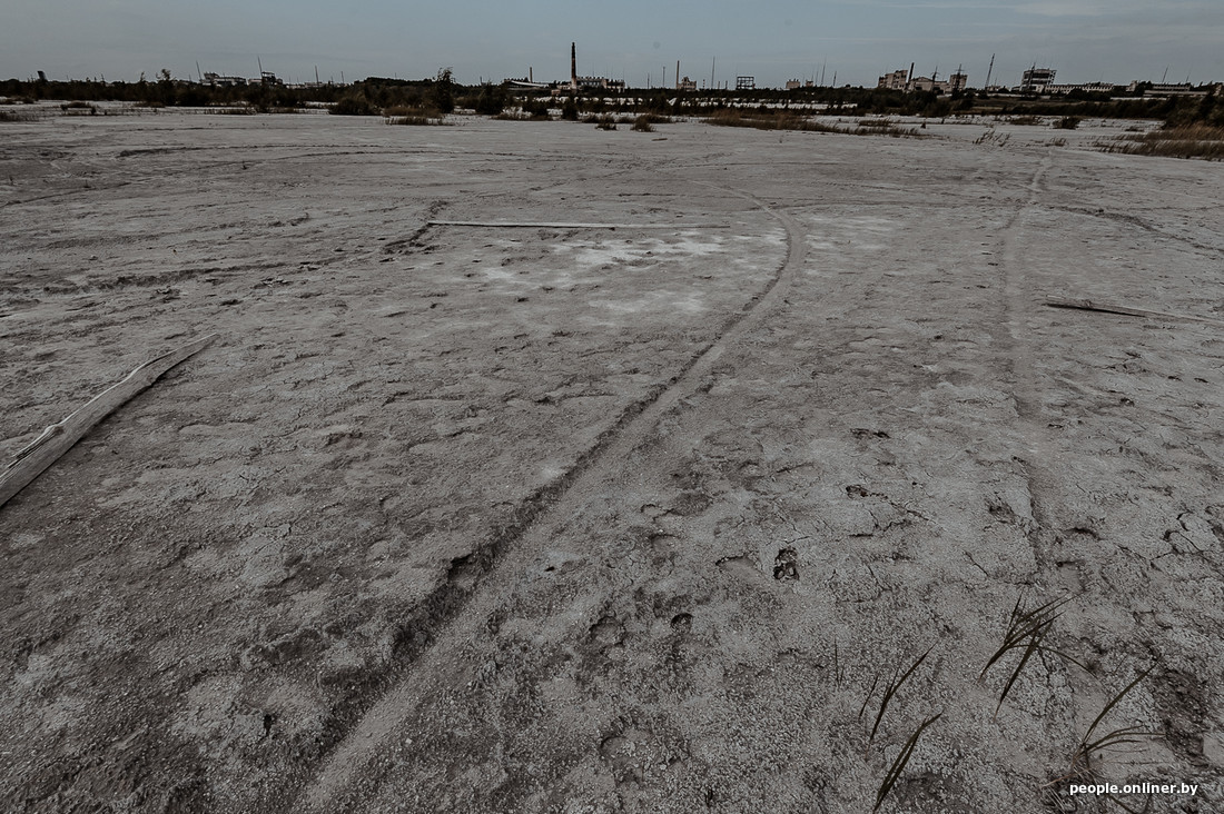 Открывшаяся картина поражает. Первое впечатление: пустыня с потрескавшимся песком. Вот только под ногами не песок, а химотходы. Если приглядеться, можно увидеть кристаллы соли — похожей на вид смесью покрывают дороги зимой. Но сейчас +15 градусов, и асфальта тут никакого нет. Вообще никого нет: пространство безжизненное…