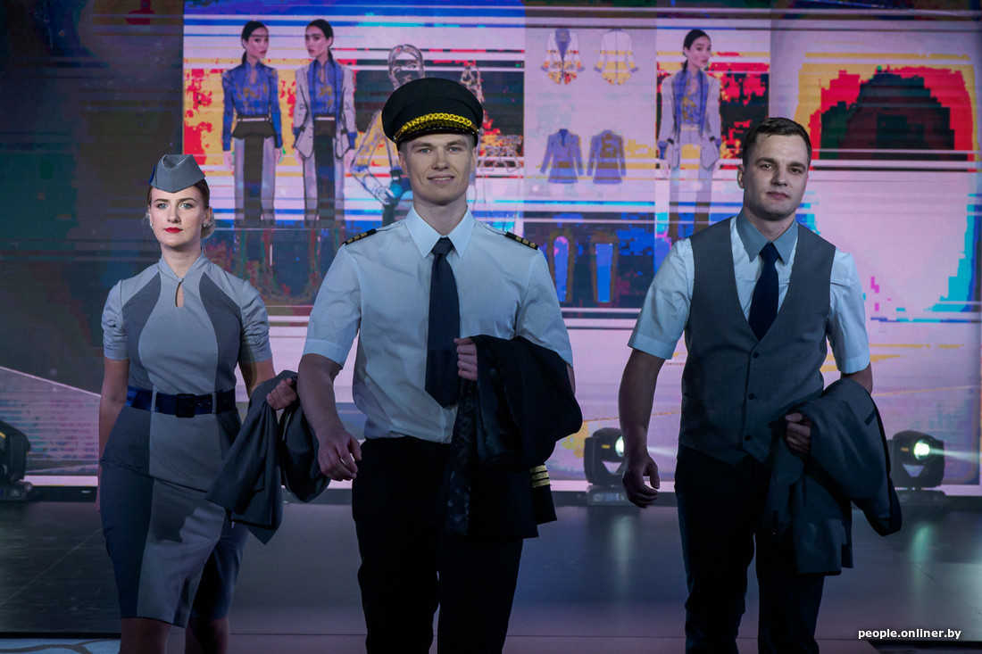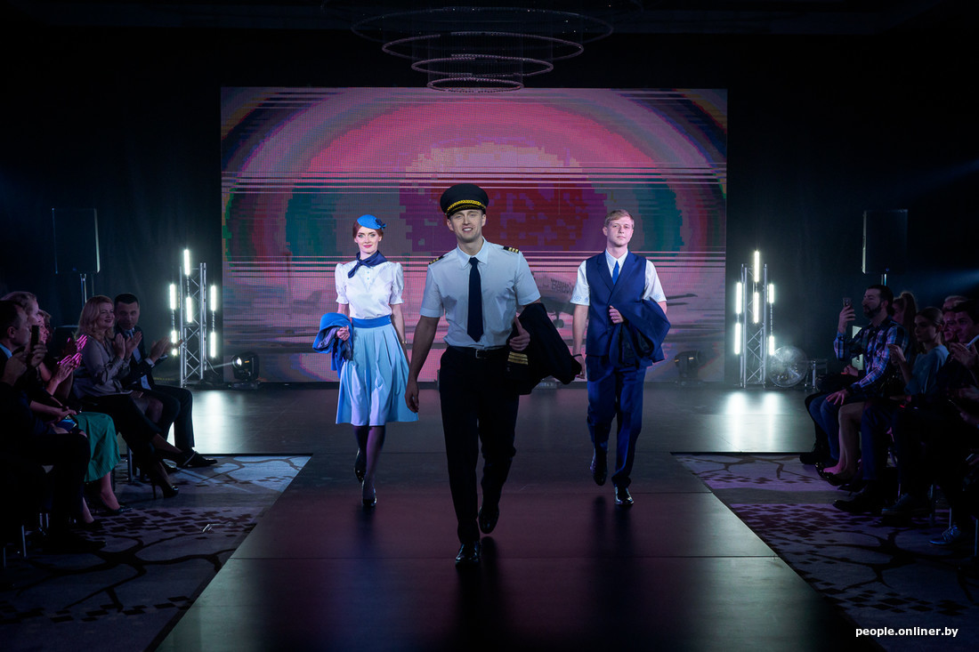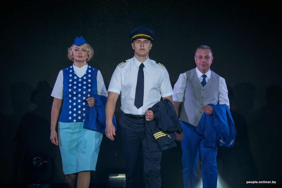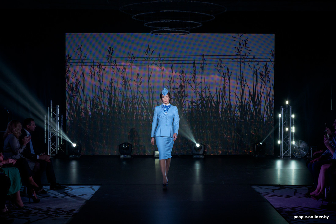 Потом показали настоящих стюардесс под предводительством первой в истории белорусской авиации девушки-пилота Натальи Титенковой. Девушки напомнили, как выглядит нынешняя форма.