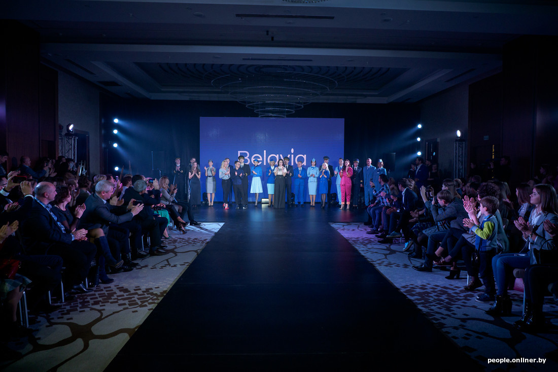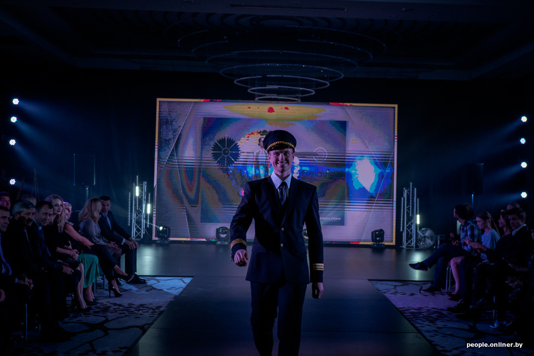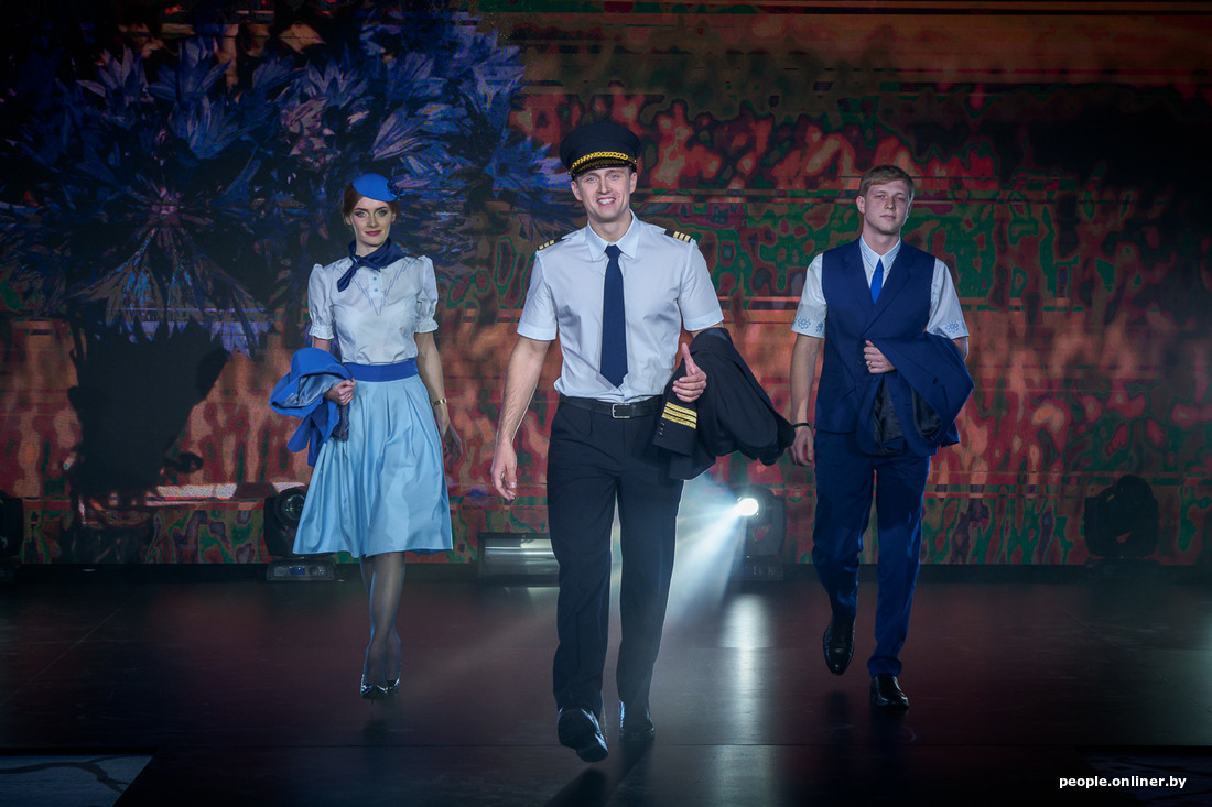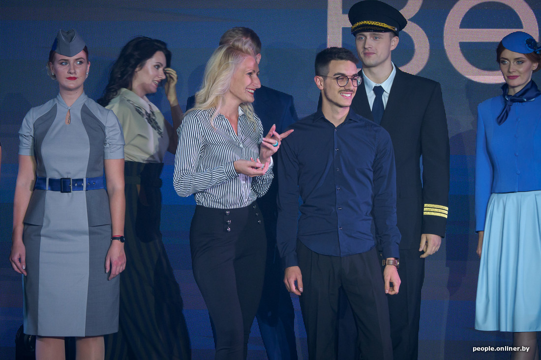 Потом показали настоящих стюардесс под предводительством первой в истории белорусской авиации девушки-пилота Натальи Титенковой. Девушки напомнили, как выглядит нынешняя форма.