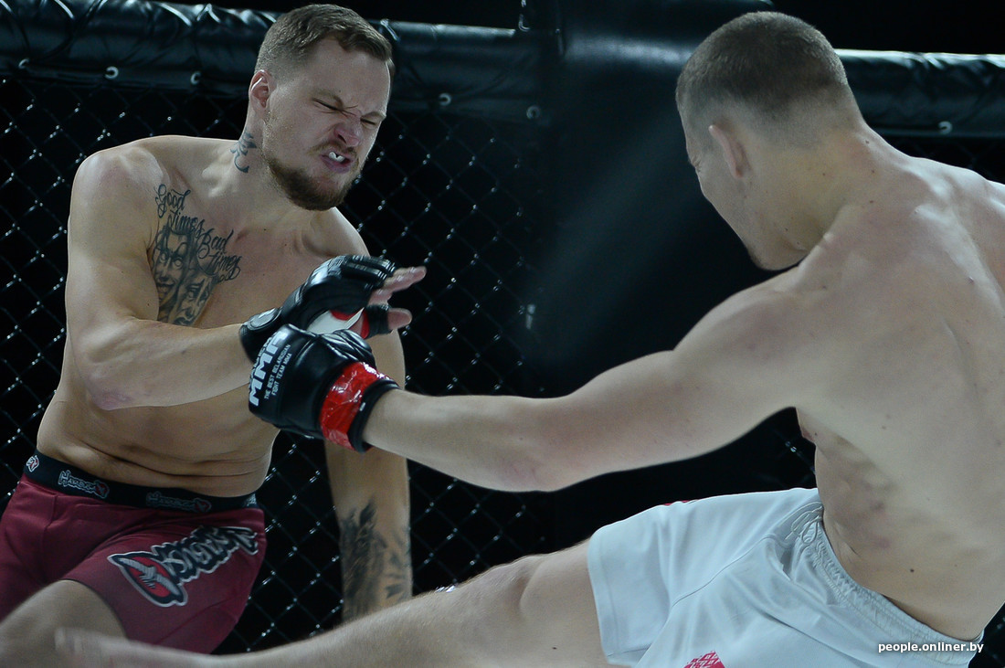 Спортивный мордобой формата MMA — это могучая смесь почти всего. Борцовская и ударная техники, болевые и удушающие приемы. Чтобы разобраться друг с другом, у оппонентов есть три раунда по пять минут. Вчера в Минске собрались спортсмены из семи стран. Они драматично били друг дружку, а когда не делали этого, зрителям давали русский рэп в исполнении Джигана и Сереги. Дело было в новомодном Falcon Club, который активно принимает у себя самый разный минский спорт. В этот раз в помещении смонтировали октагон.