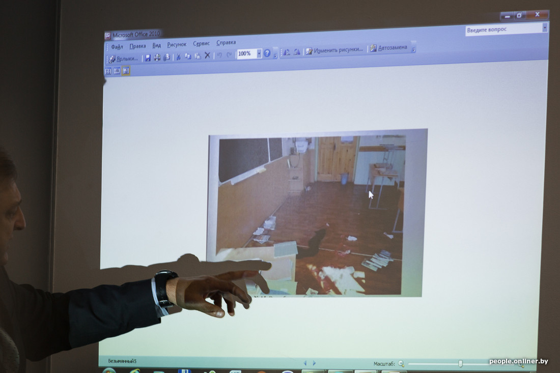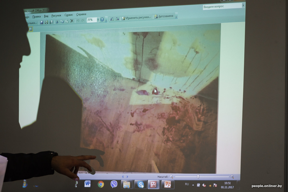 На экране появляются фотографии с места преступления. На снимках видны лужи крови на полу и потеки на стене. На учительском столе достаточно ровно сложены тетрадки. Разбросанные по полу учебники правозащитники объясняют тем, что пришедшие на помощь учителя подкладывали их ей под голову.