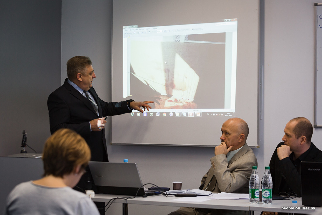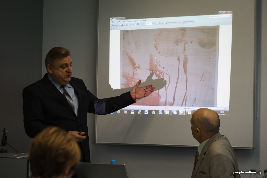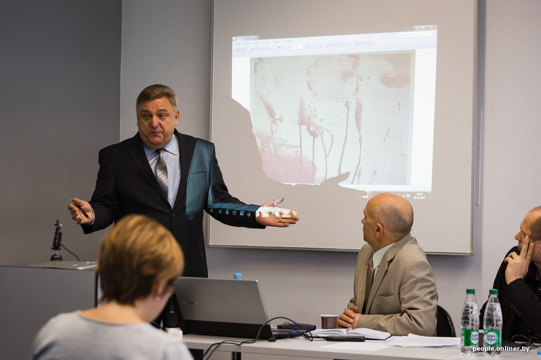 — Согласно заключениям биолого-генетических и медико-криминалистических экспертиз установлено, что смывы крови с левой руки Скакуна образованы в результате смешения биологического материала от Губаревич и Скакуна, — объяснял заместитель начальника управления СК Беларуси по Минску Евгений Архиреев. — Следы брызг, обращаю внимание, брызг крови на рубашке, пиджаке, брюках и туфлях образовались в результате падения летящих частиц крови. Помарки крови в виде мазков и отпечатков на рубашке и туфлях образовались в результате динамического и статического контакта с поверхностью, покрытой жидкой кровью. Следы крови на пиджаке, рубашке и туфлях произошли от Губаревич. При генетическом исследовании также установлено, что отдельные следы крови на пиджаке Скакуна могли быть образованы в результате смешения биологического материала крови Губаревич и Скакуна.