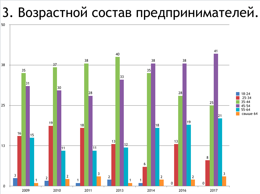 — Среди ИП только 30% мужчин, основная масса предпринимателей женщины, — объясняет Анатолий Шумченко. — При этом сектор ИП стремительно стареет — 65% предпринимателей старше 45 лет, 33% — это люди от 25 до 44 лет. Мы можем видеть, что основная масса предпринимателей начала свою деятельность 20—25 лет назад и нового притока почти нет, ребят в возрасте от 18 до 24 лет нет.